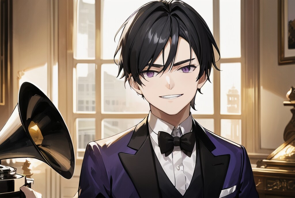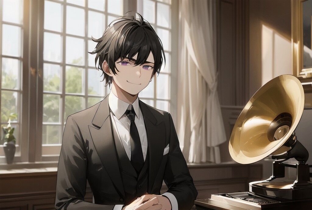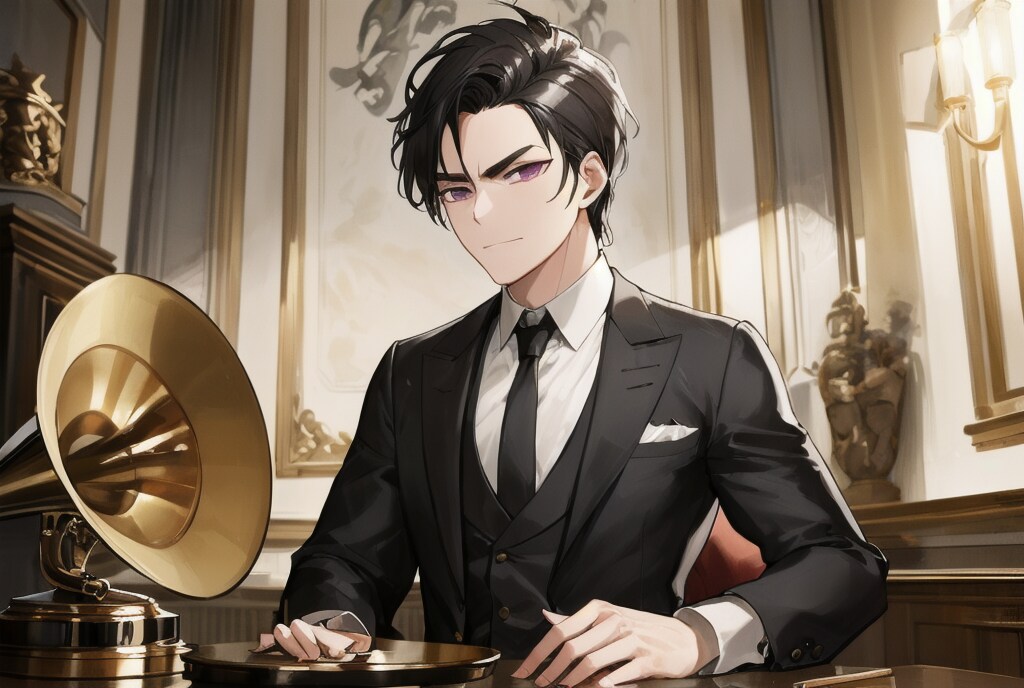 蓄音機ということで、雰囲気的に似合いそうないつもの黒髪短髪男性達で生成してみました。それっぽい雰囲気をお楽しみ下さい…!!色合いや雰囲気が気に入っています。