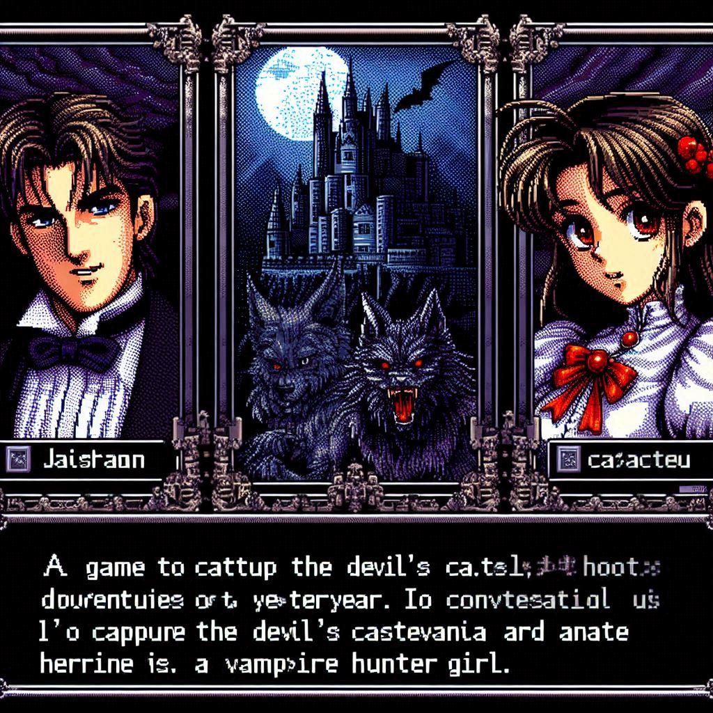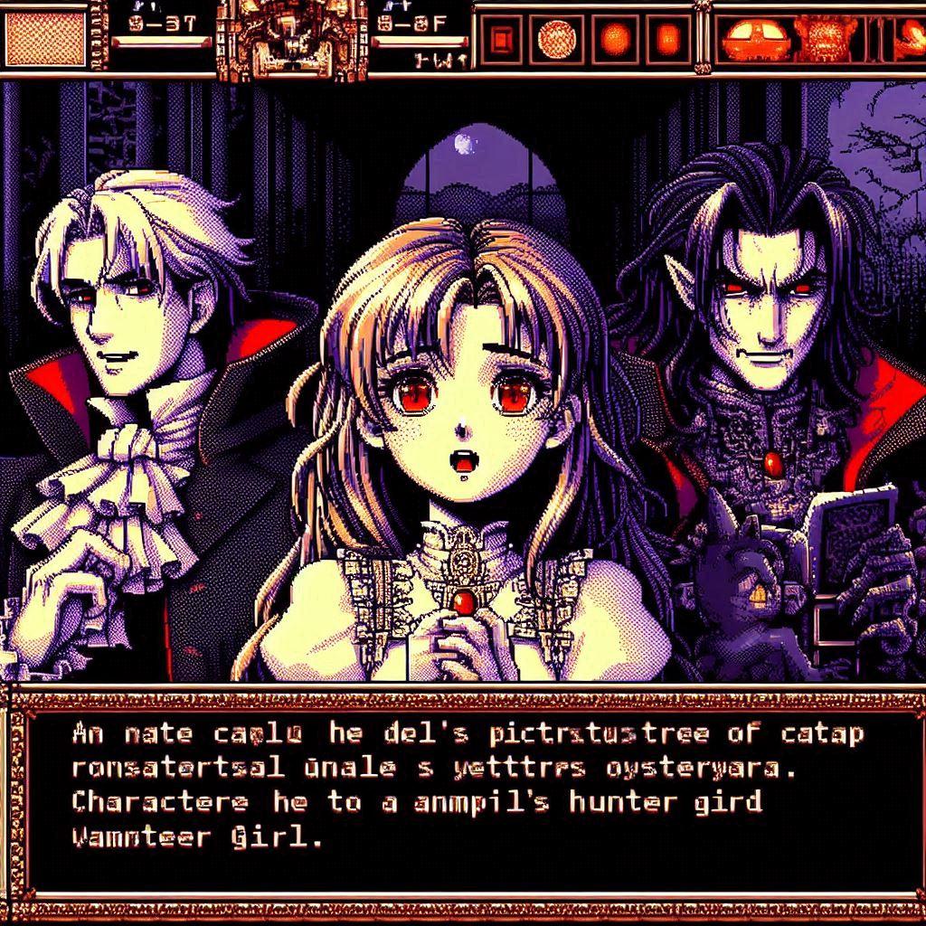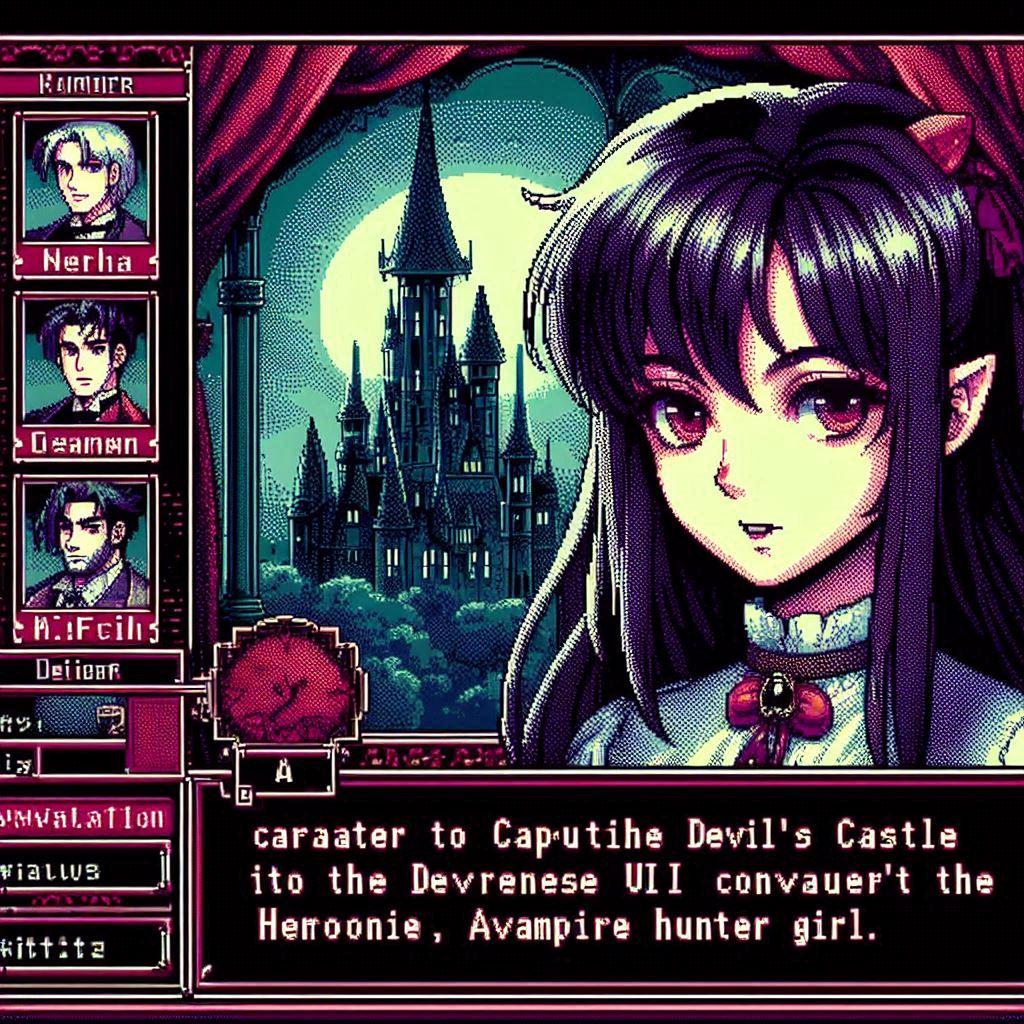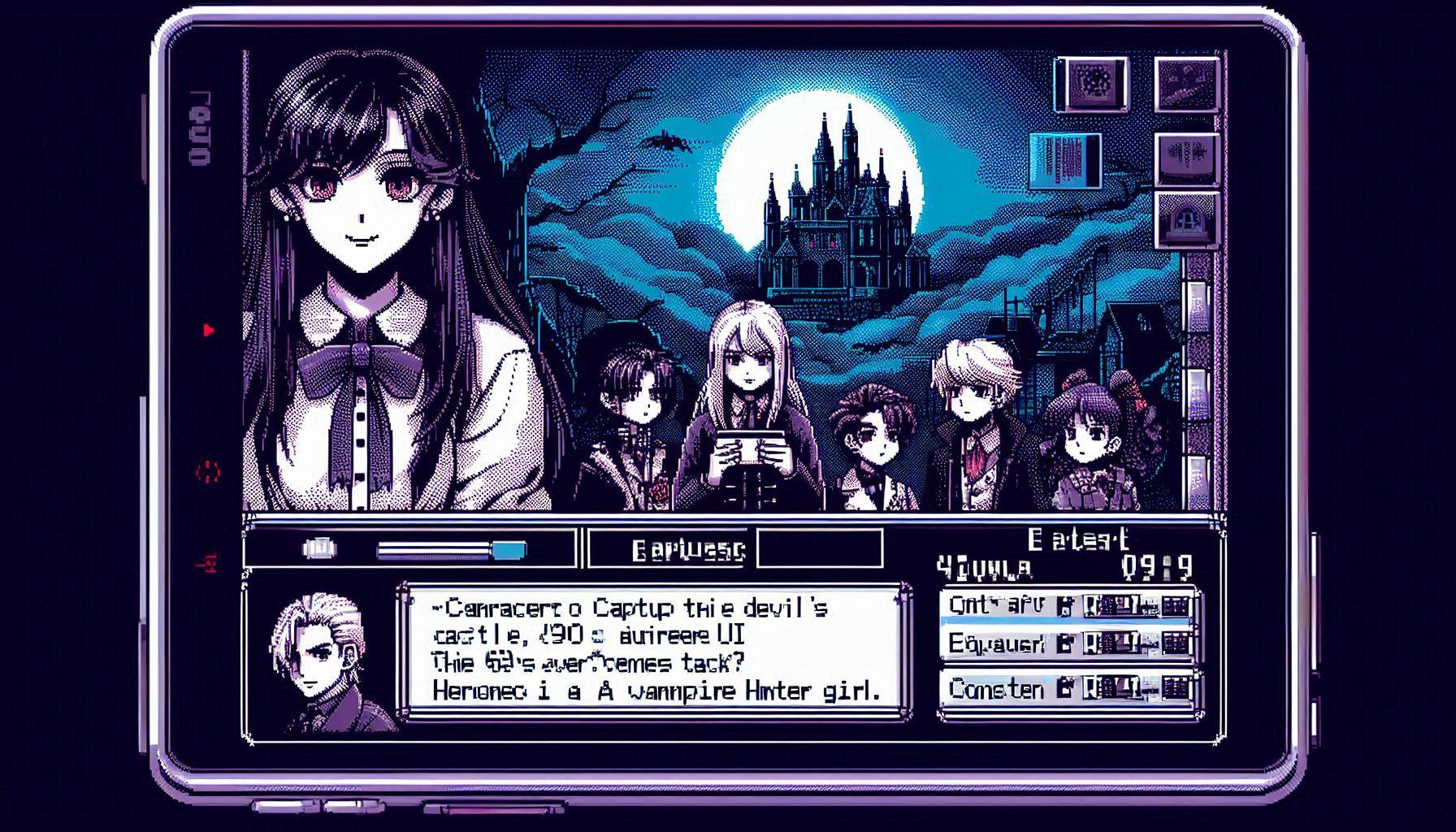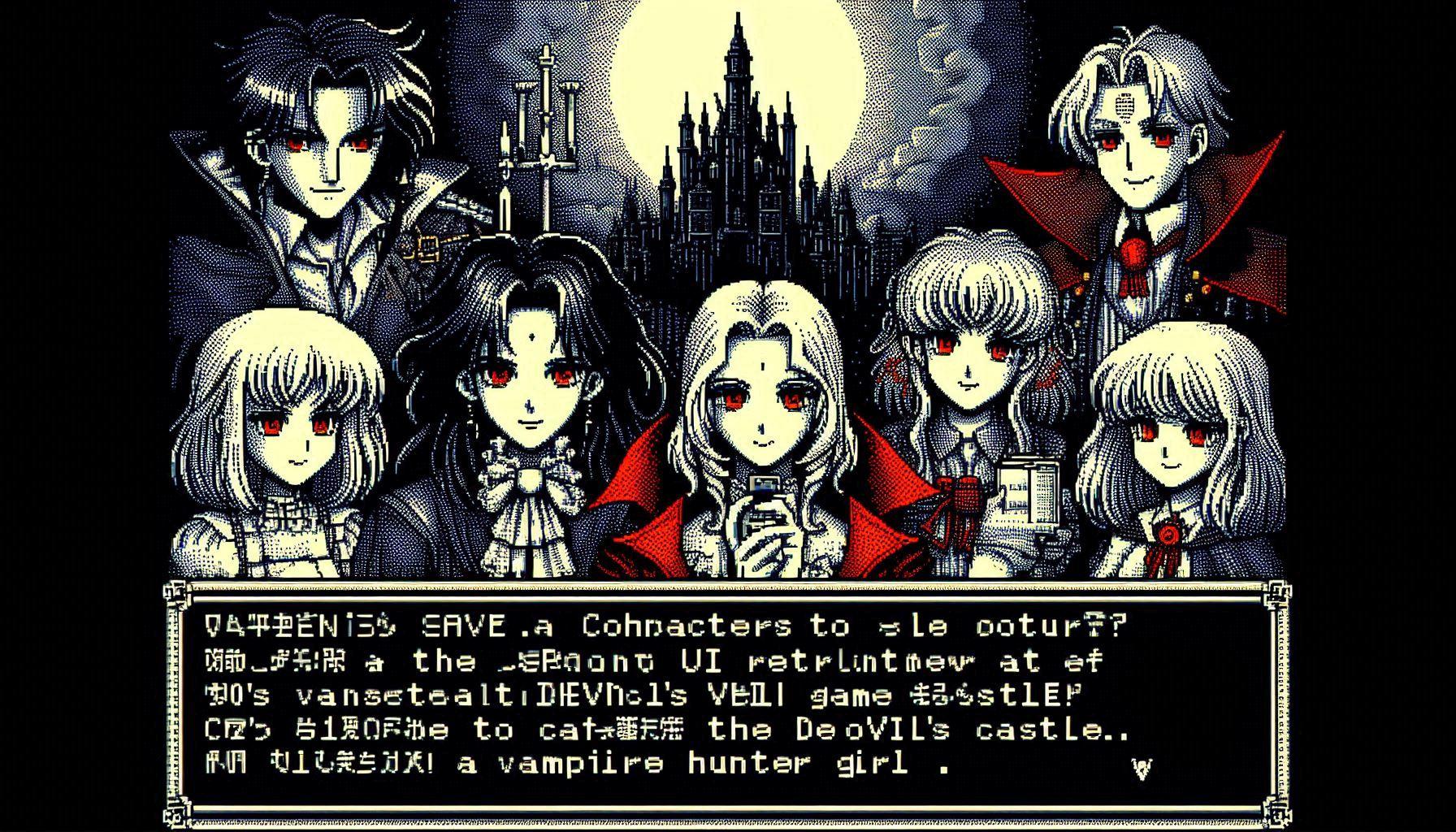 悪魔城に挑む!ヴァンパイアハンター達が主役のアドベンチャーゲームのゲーム画面!(同じ呪文でDalleとImageFX)