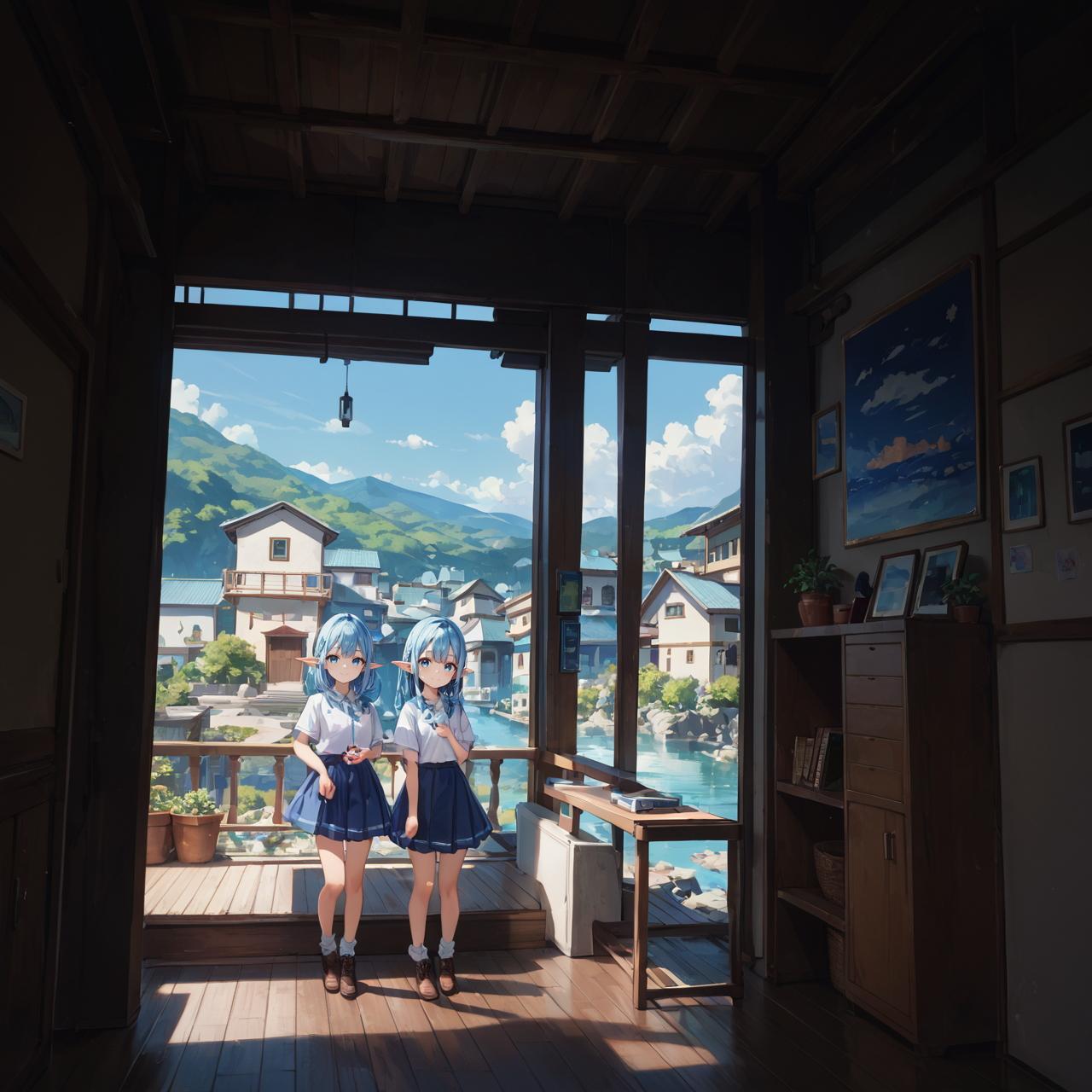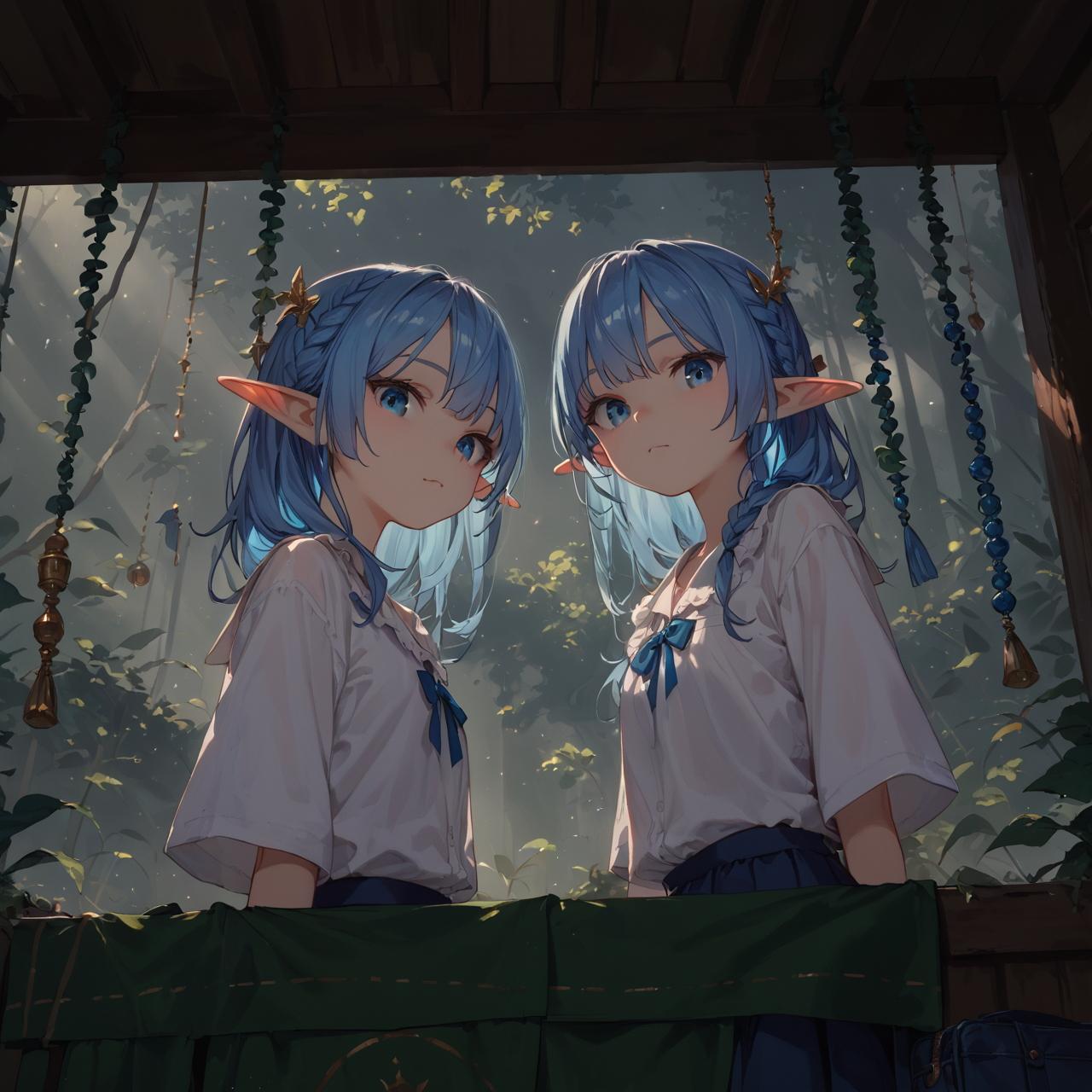 アネ・Ane(青髪のエルフ。おっとりした性格だが魔法は特級クラス、道中は得意の変身魔法で様々なコスプレを楽しんでいる。自由奔放に深い交友関係を築くので、その事で妹に心配をかけている)