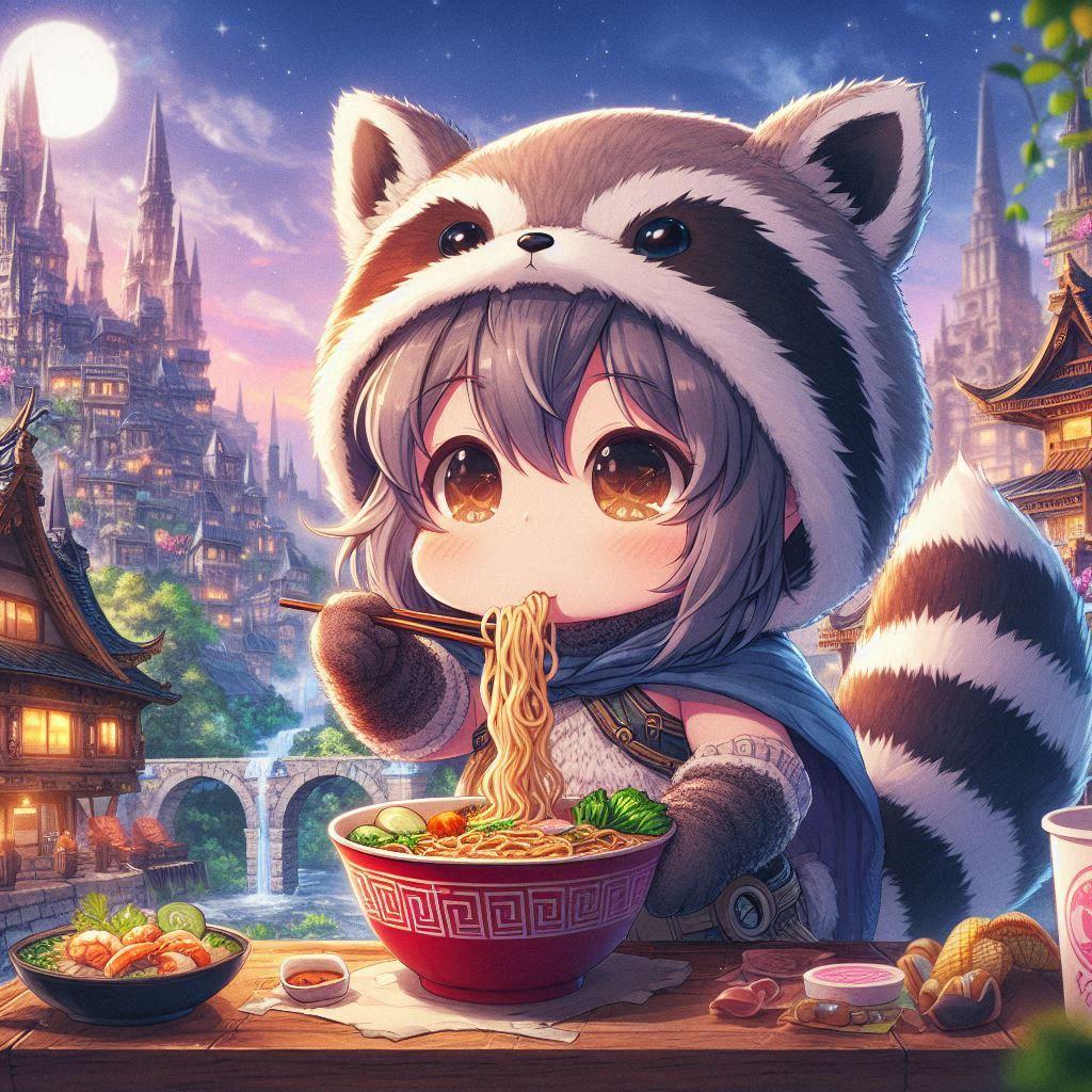ぽっちゃりタヌキがラーメン食べてます。