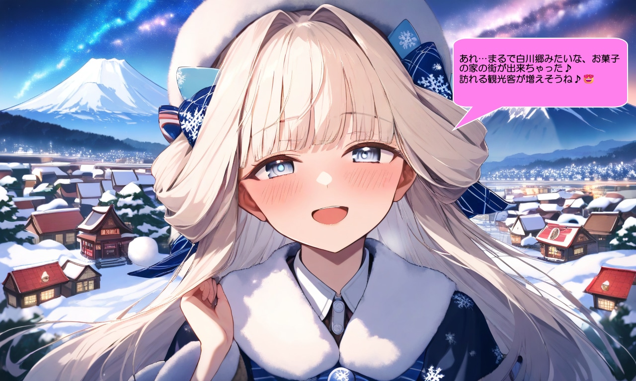猫屋敷ユキ:あれ…まるで白川郷みたいな、お菓子の家の街が出来ちゃった♪訪れる観光客が増えそうね♪😍