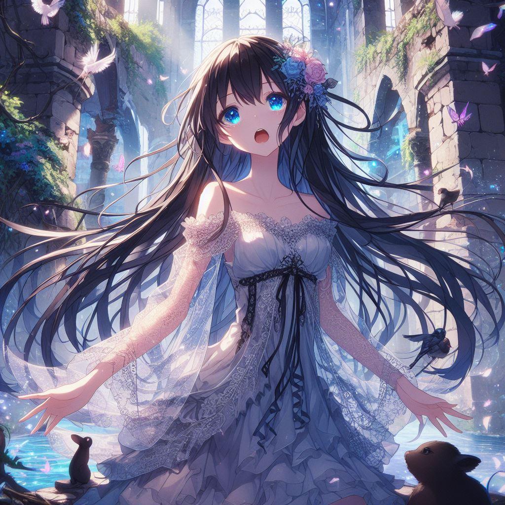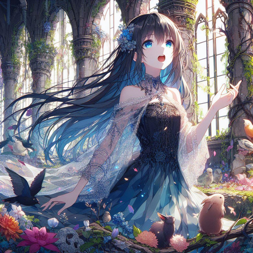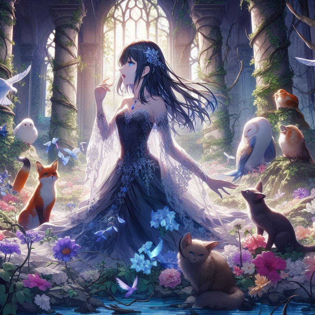 鳥や動物達が彼女の周囲に集まり、彼女の存在に何かを感じ取っているようだ。