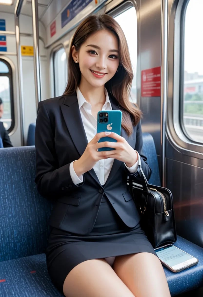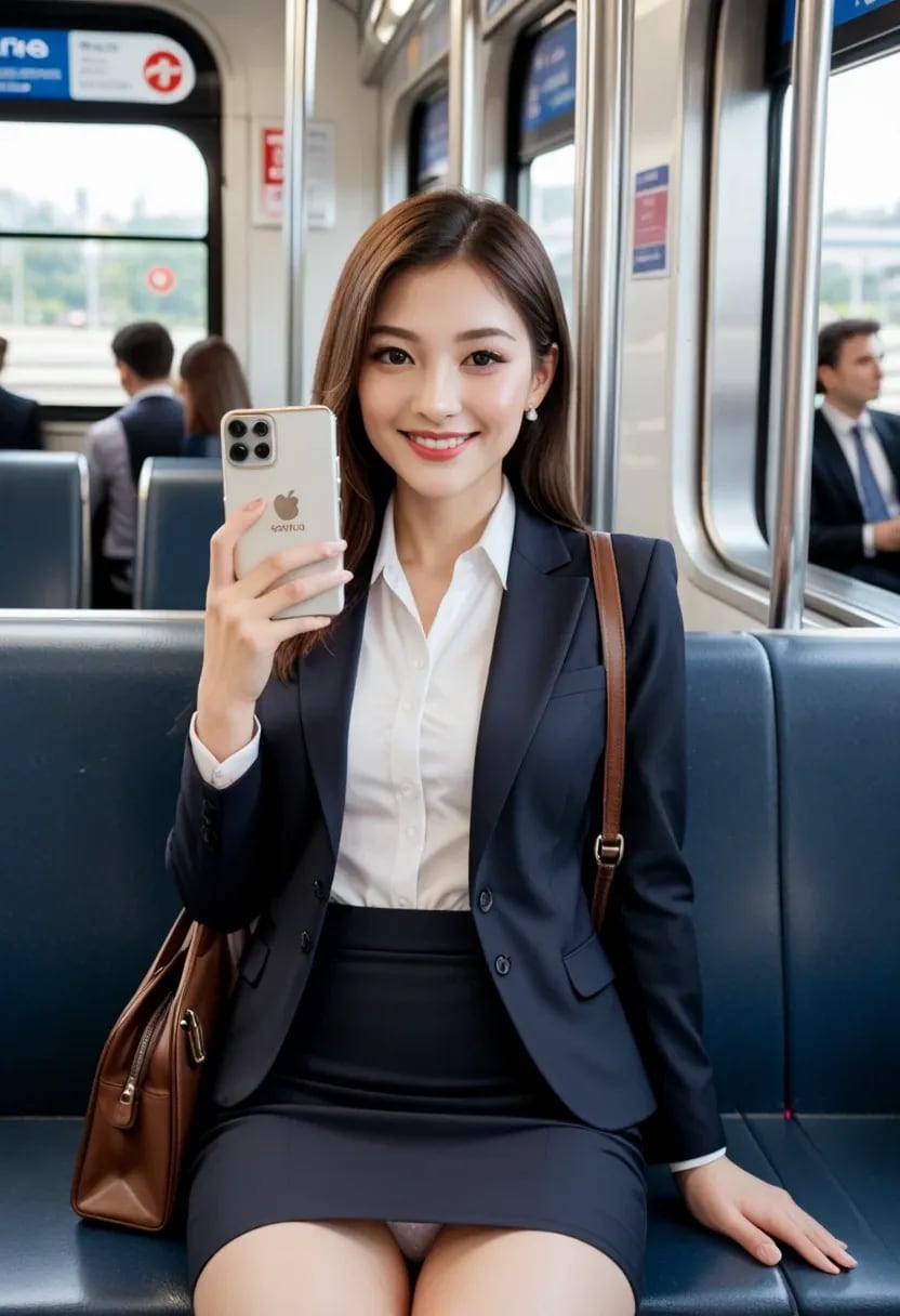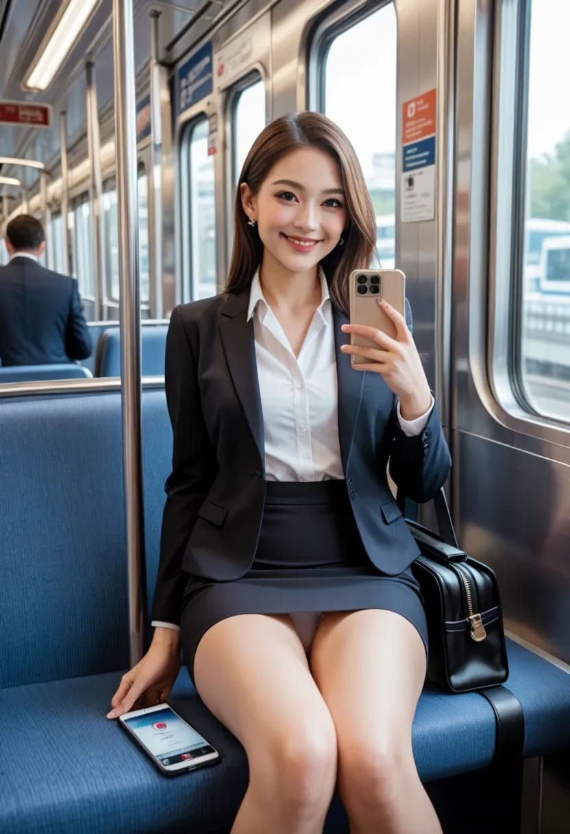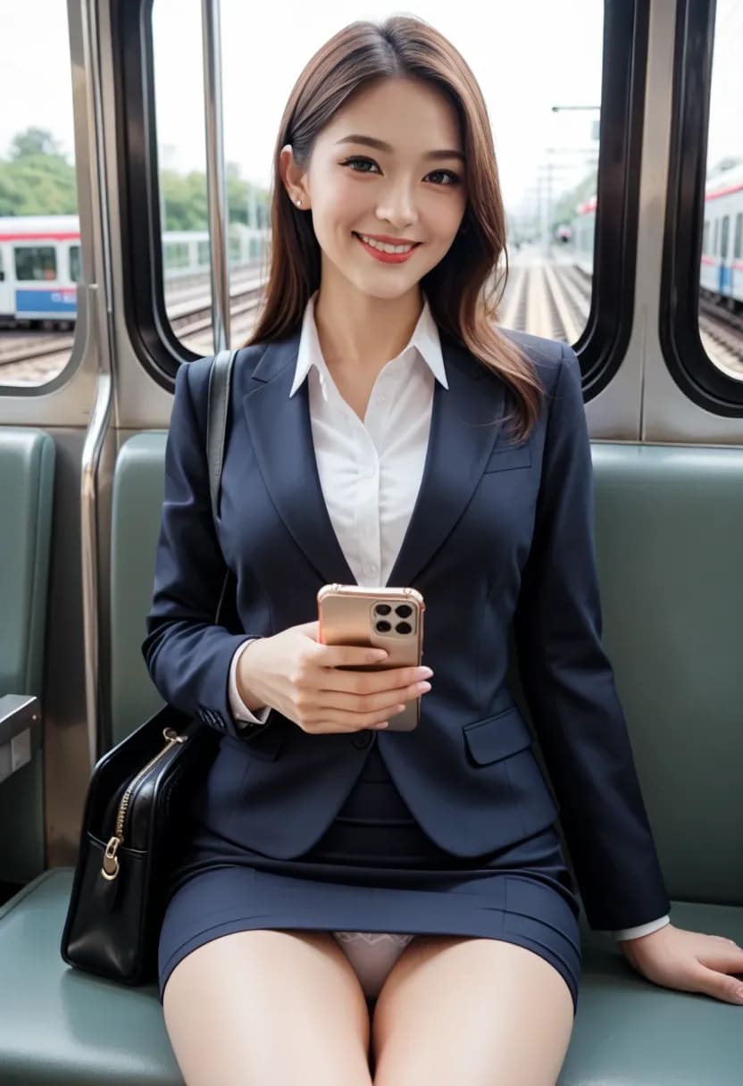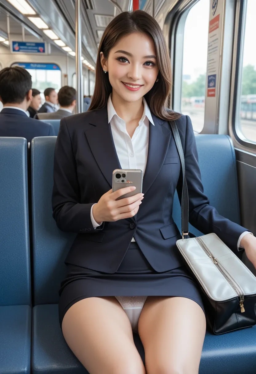 電車の中で微笑んでくれるけど、パンツが見えちゃってるお姉さん。