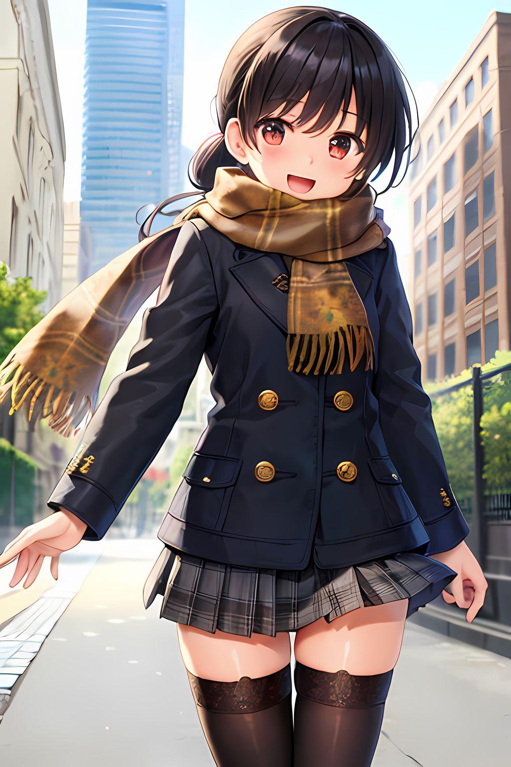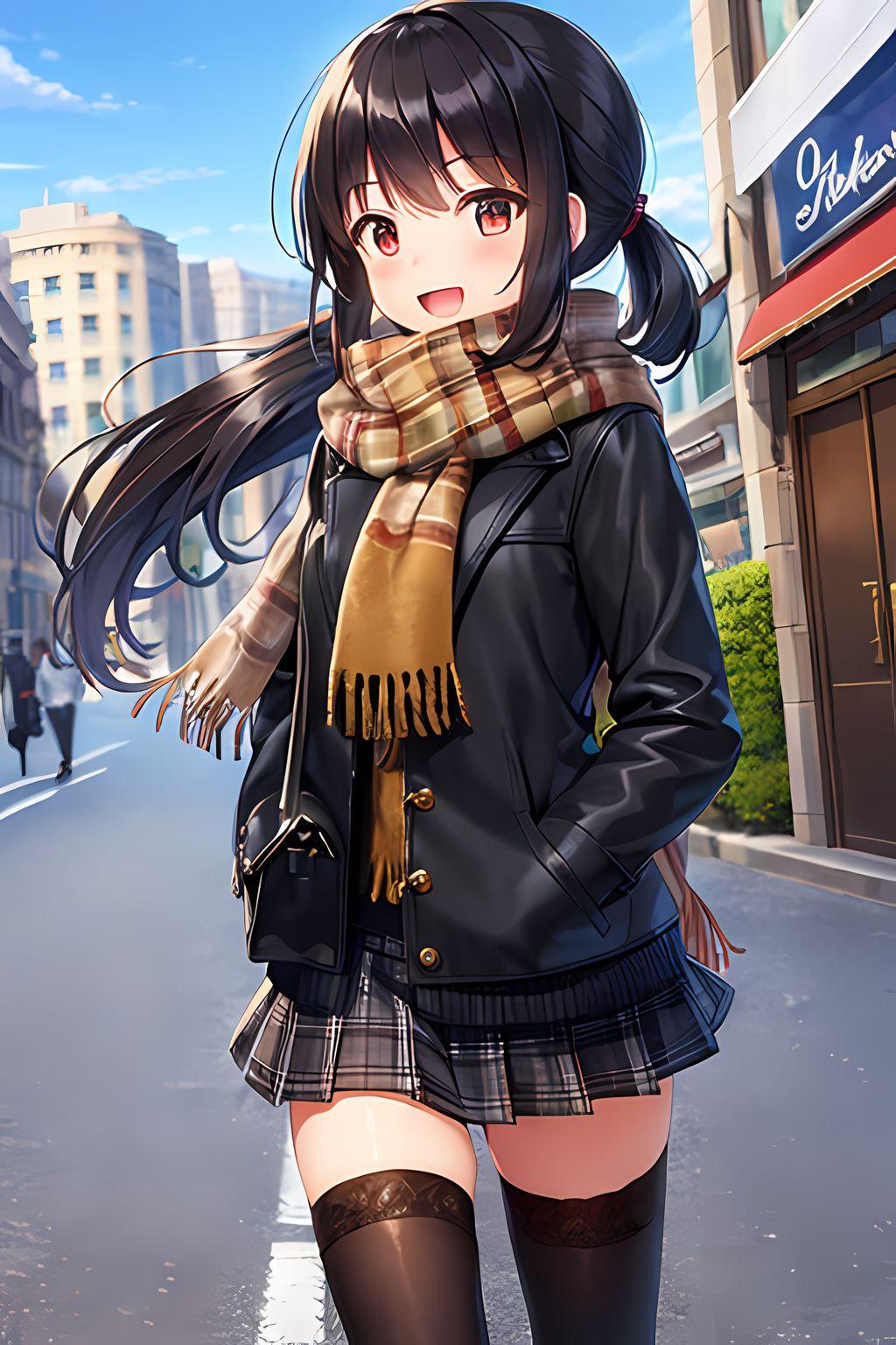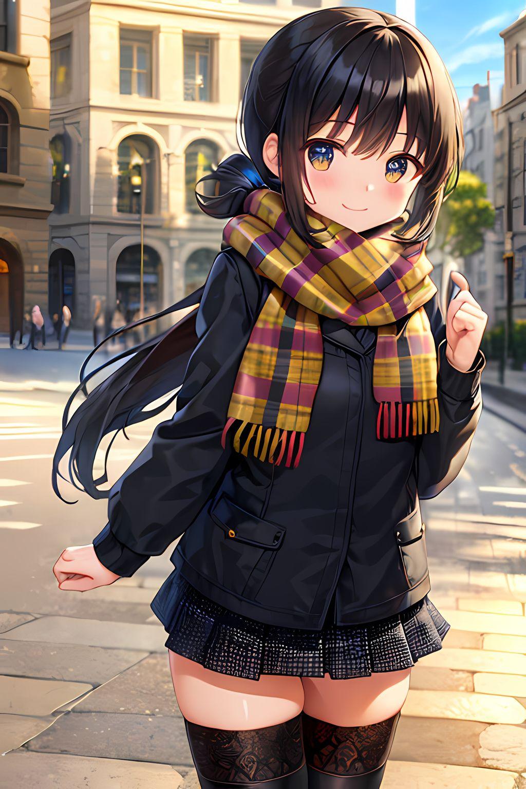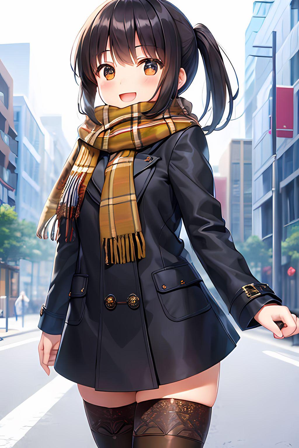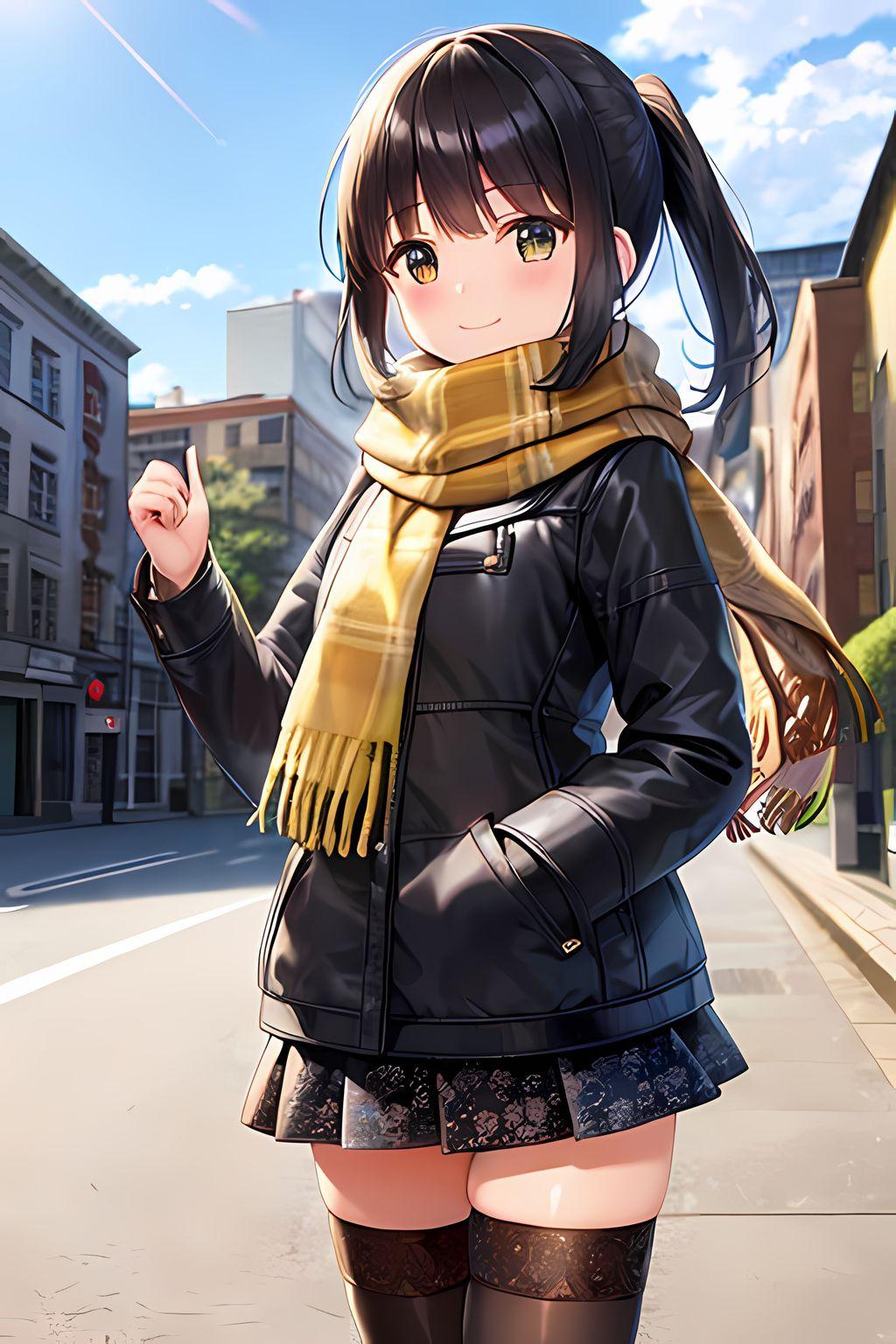 女の子はいつもの黒髪ポニーの茶瞳っ娘にマフラー巻いてもらいました(お目々奇麗Ver)