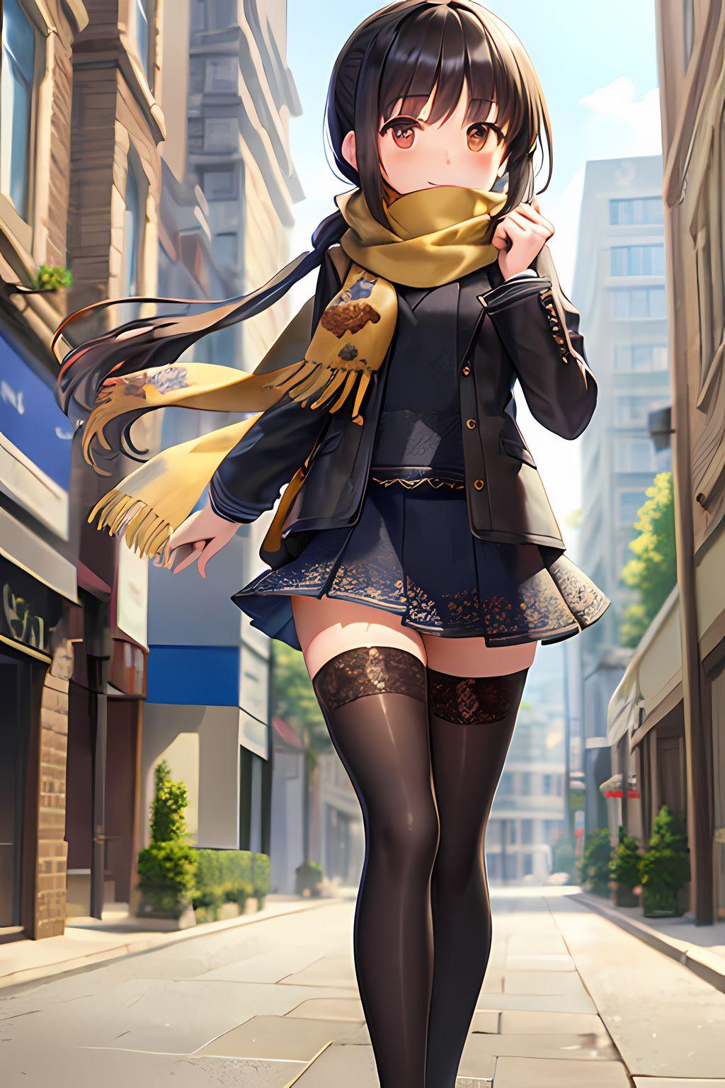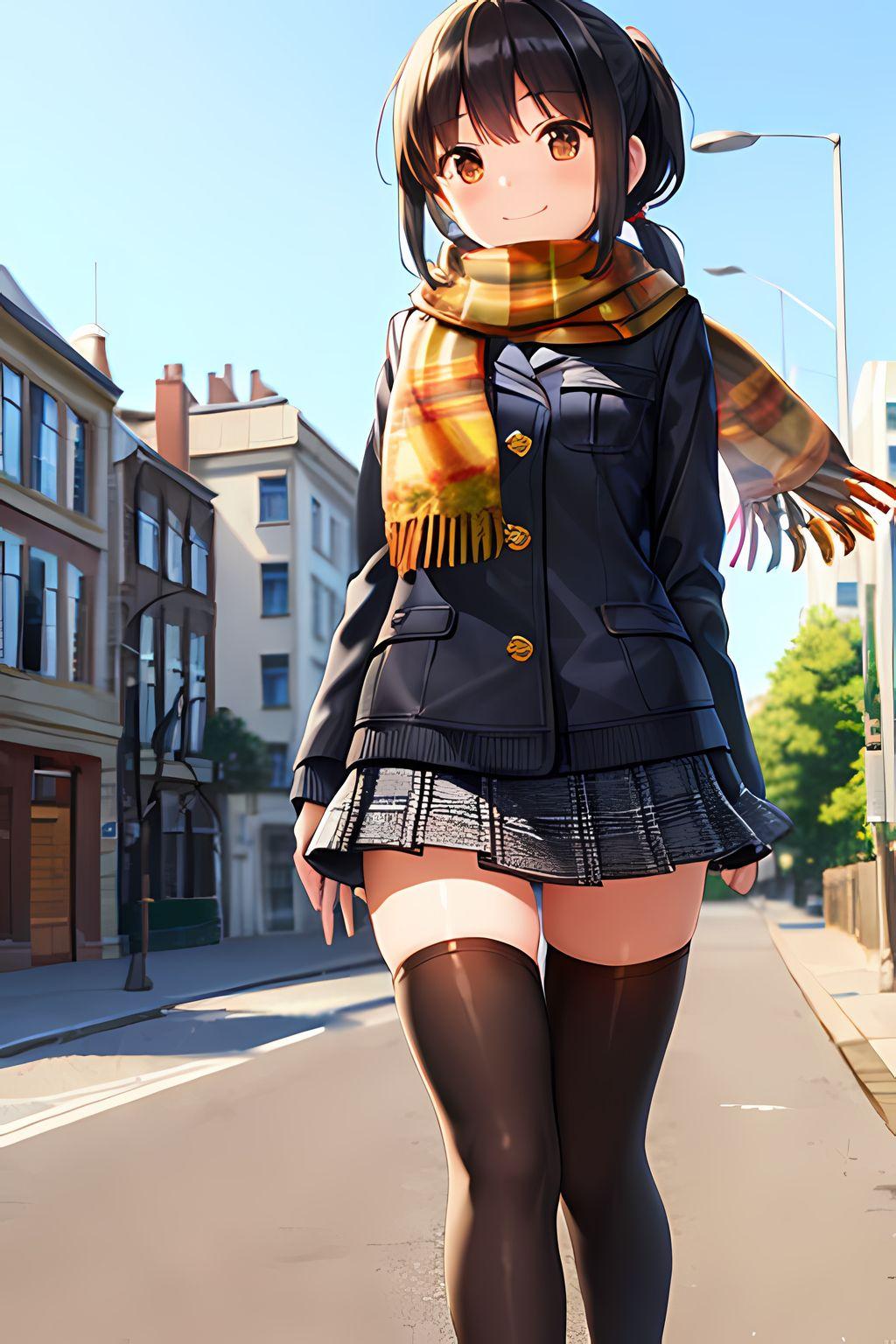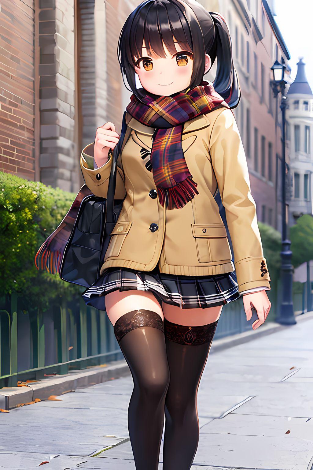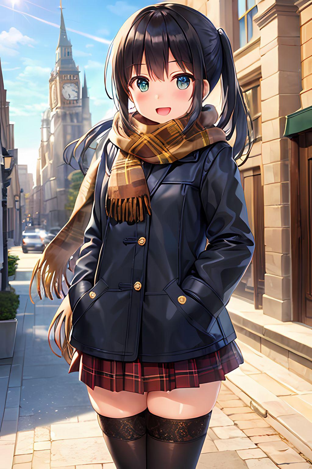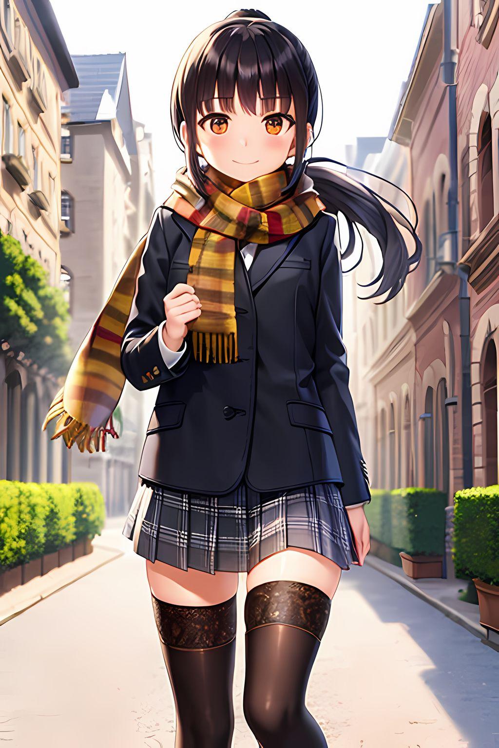 女の子はいつもの黒髪ポニーの茶瞳っ娘にマフラー巻いてもらいました(お目々奇麗Ver)
