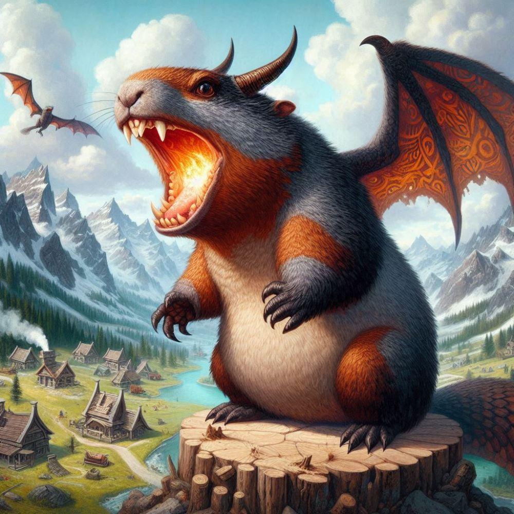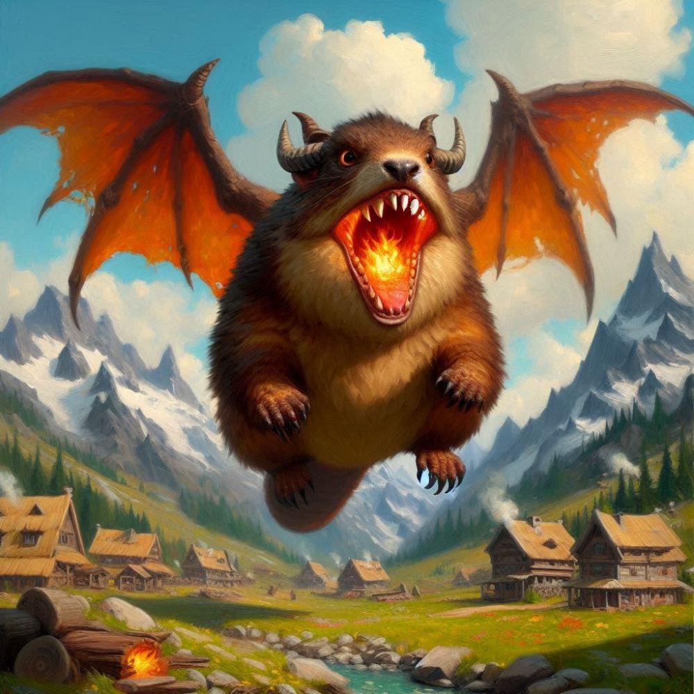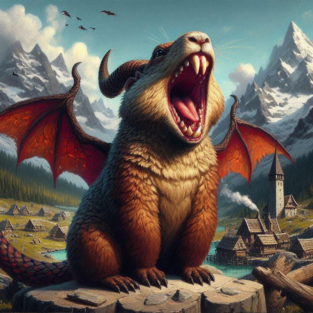 ファンタジー油絵風、空飛ぶドラゴンマーモット