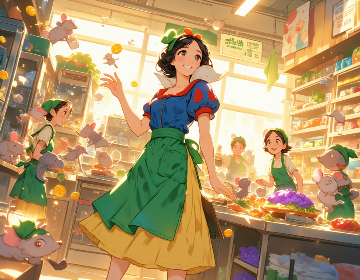 Situation: A fairy tale princess, inspired by classic fairy tales, meticulously supervises a team of human-sized birds and mice in the supermarket’s deli department as they skillfully prepare quirky deli items like glowing sandwiches, "pui-flavored" sushi rolls, and moonlit mushroom salads. The princess hums cheerfully, remarking, “The cost is still at 30 yen; there’s room for further trimming, I believe,” while her sparkles accidentally double the price tags, adding to the surreal chaos.