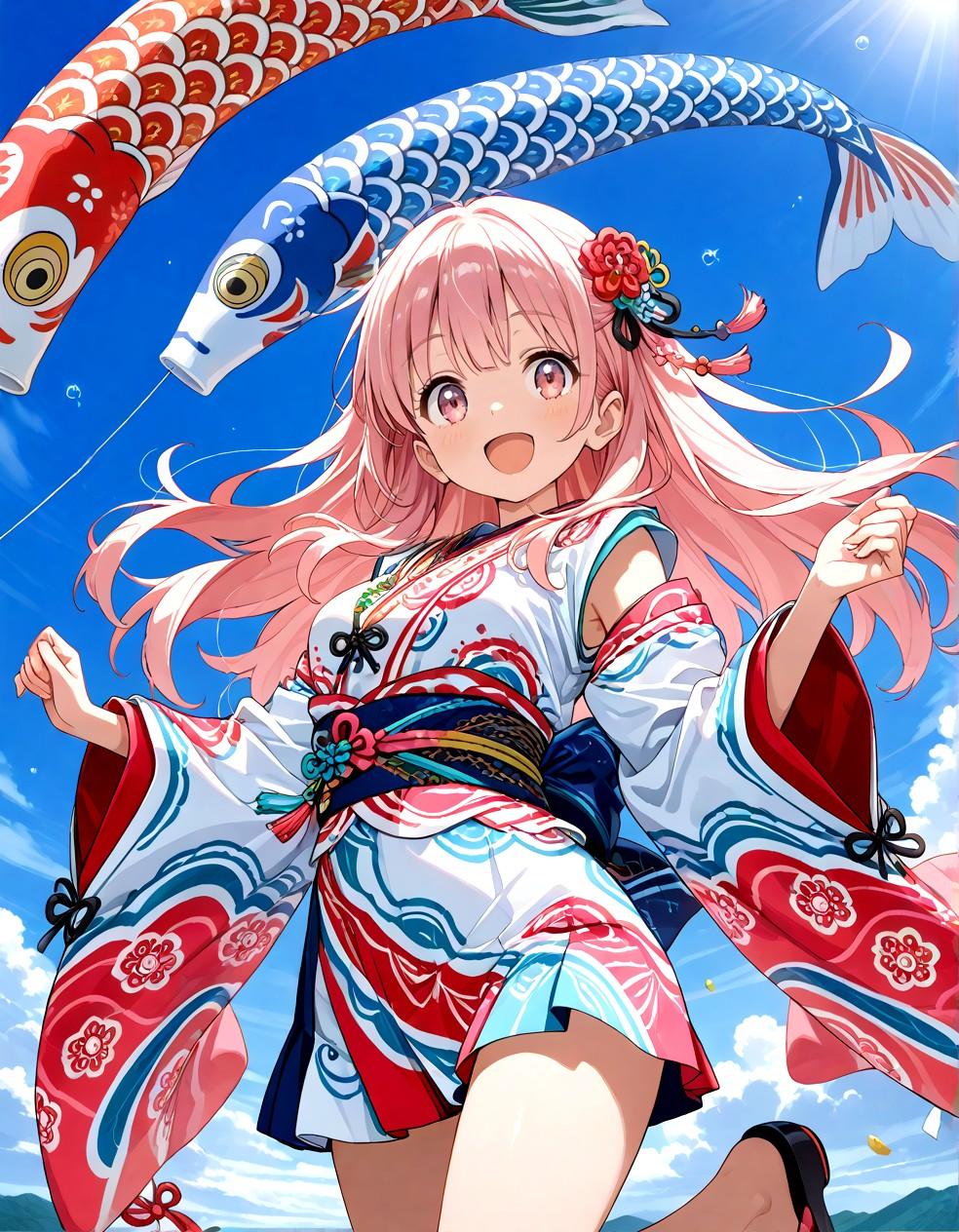 子どもの日ということで、月並みですが鯉のぼりです。ついでに鯉のぼりっぽい柄の着物にしてみました。