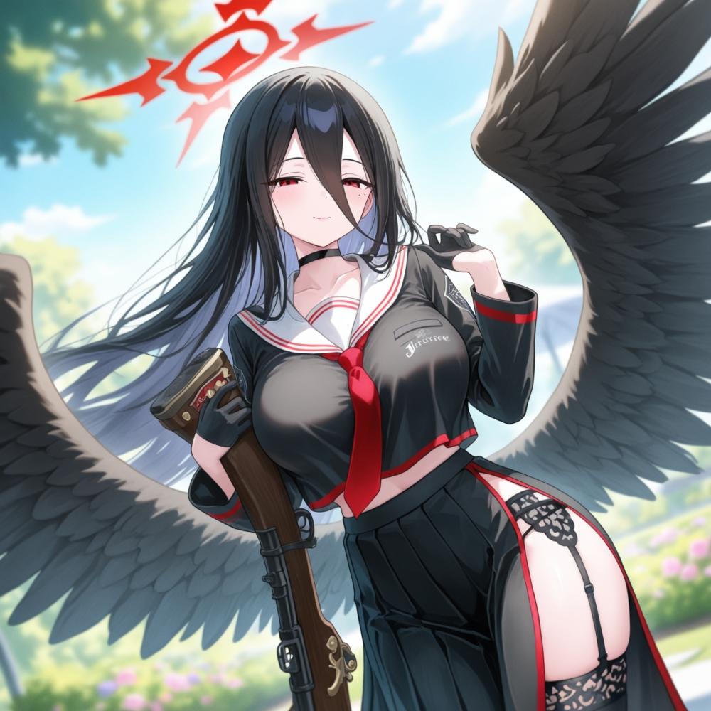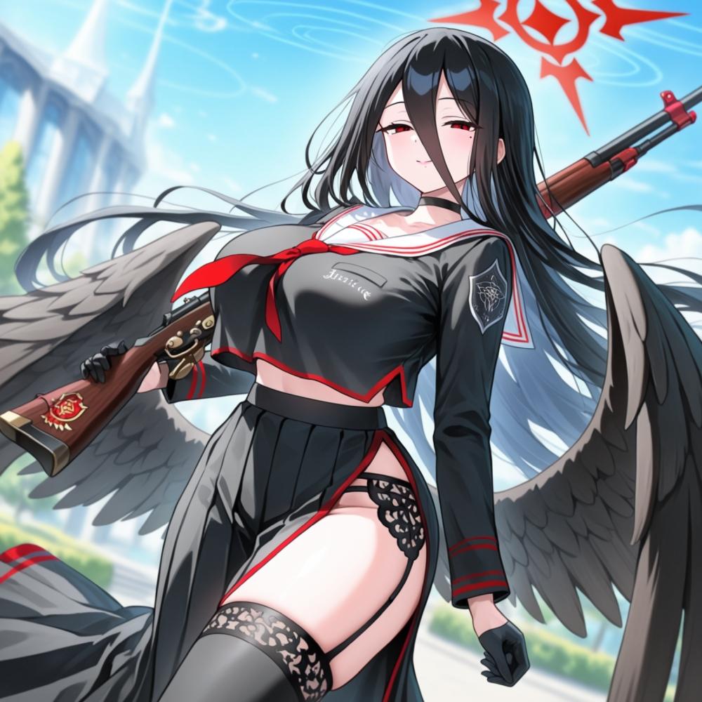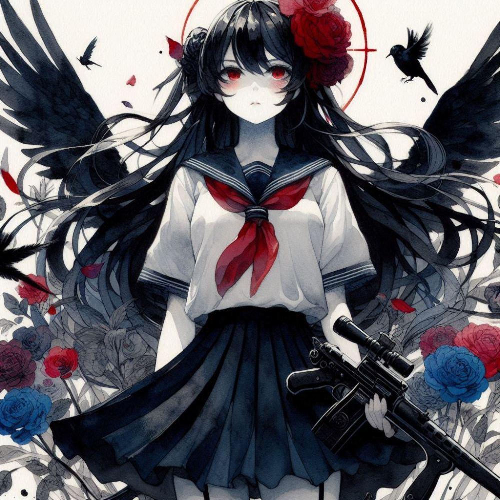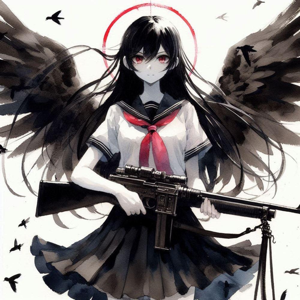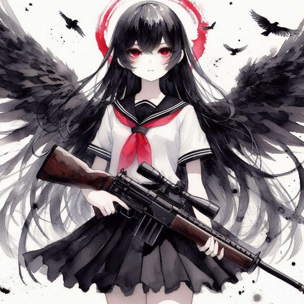 水墨画アニメ風、パトロールするチョーカー武装制服乙女