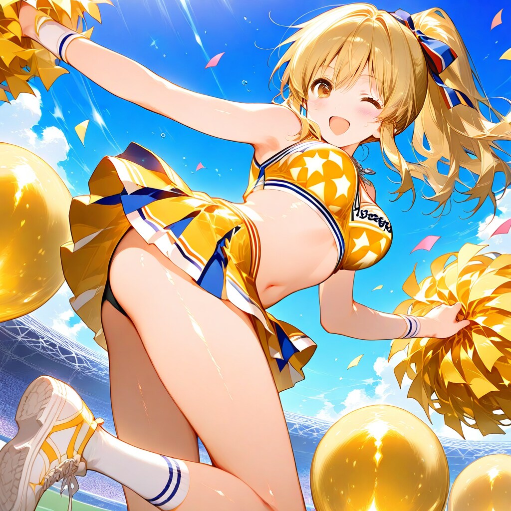 黄色の風船を持つブロンドポニーテールのチアガールの美女。