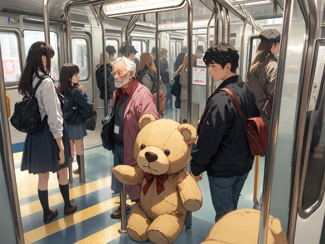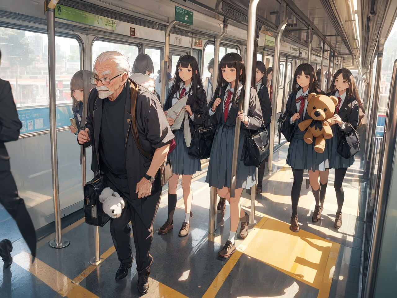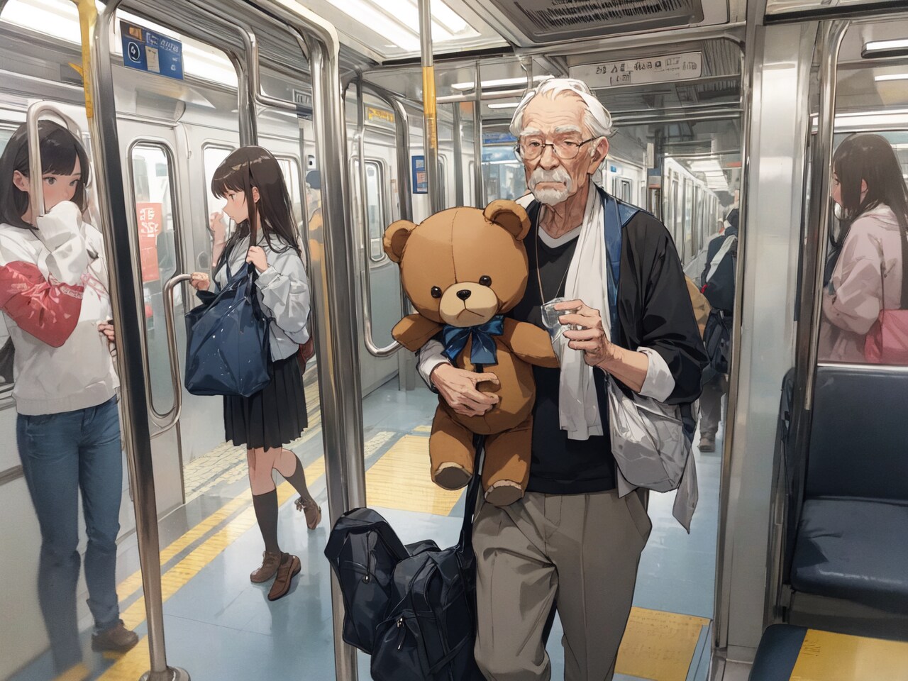 「巨大な熊のぬいぐるみ入りバッグを背負った老人が、満員電車に乗る。それを囲む女子高生たち…」