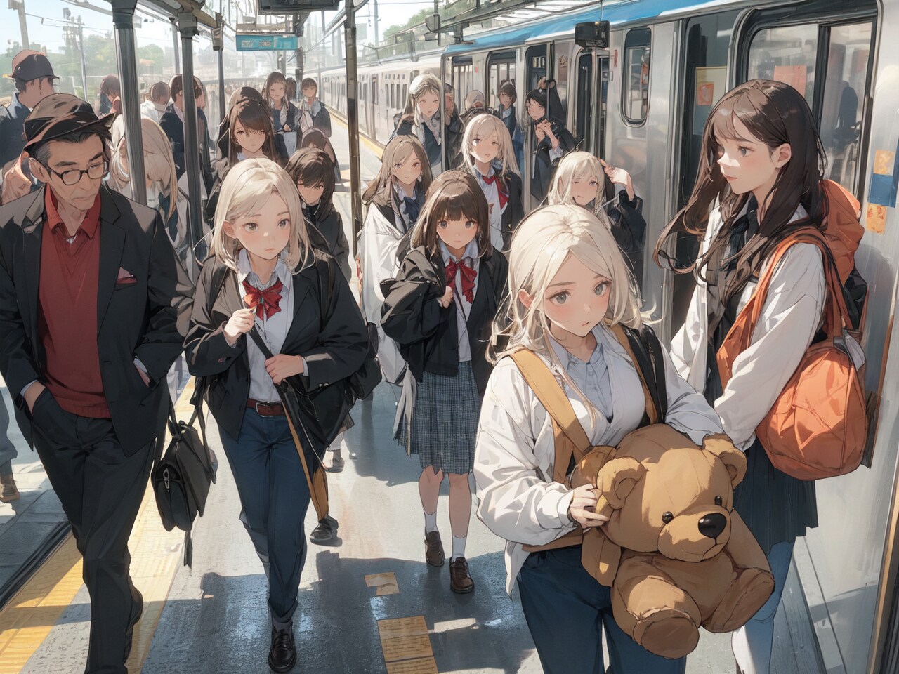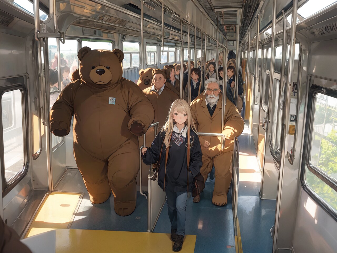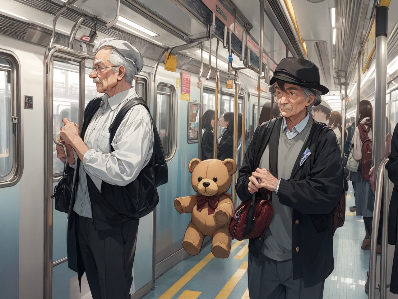 「巨大な熊のぬいぐるみ入りバッグを背負った老人が、満員電車に乗る。それを囲む女子高生たち…」