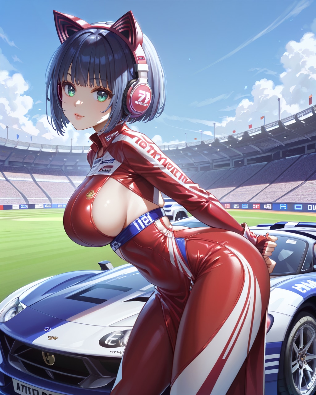 レースクイーン, (横乳,:1.13) ありえない服, ありえないボディスーツ, 赤いボディスーツ, レーシングフラッグ, カブリオレカー, スポーツカー,車フォーカス, 前傾姿勢, 横から, 横スリット, ヘッドフォン, 超ロングヘア, ソニック