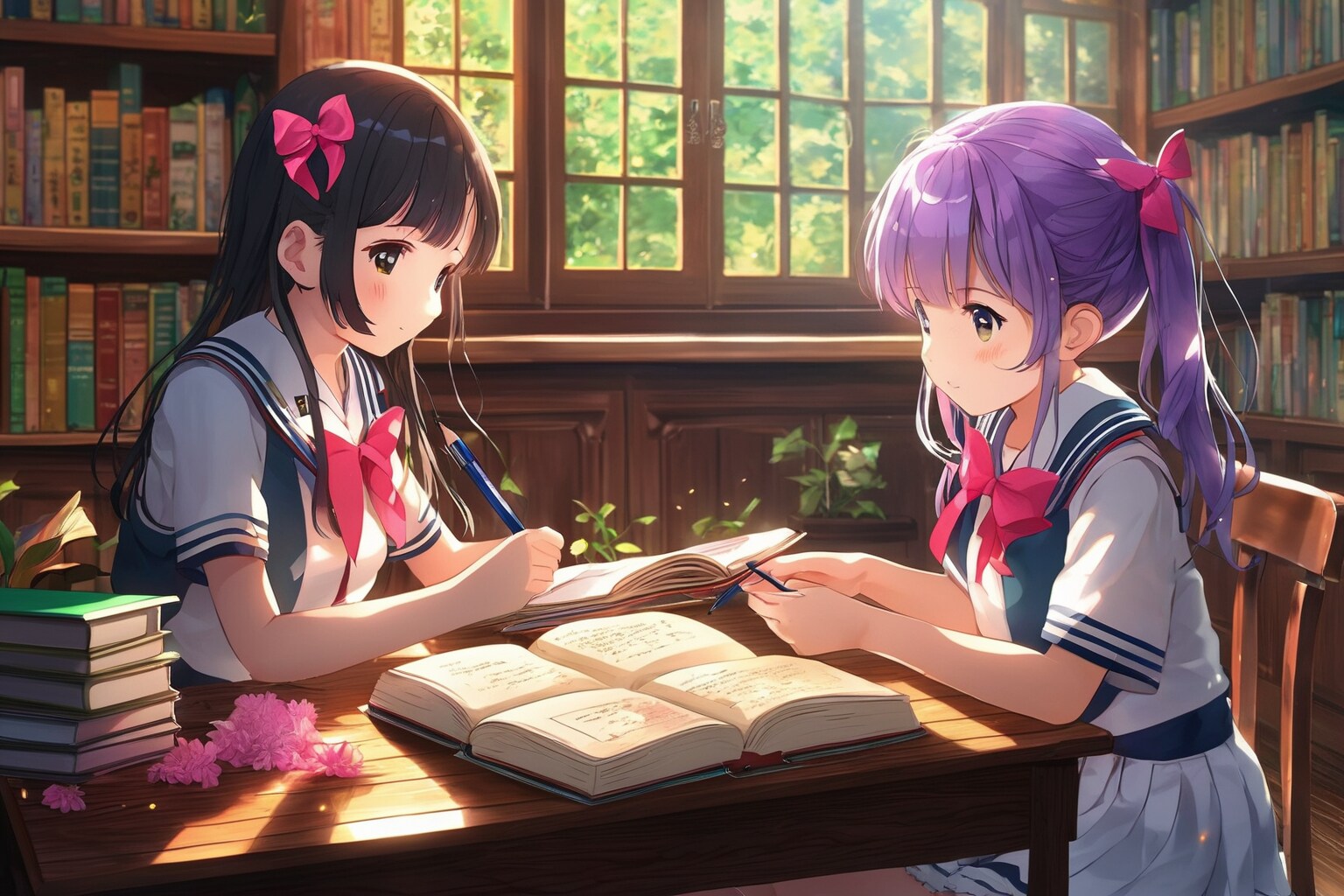 夏休みも終わりが近づいたある日、図書館で宿題を片付ける二人