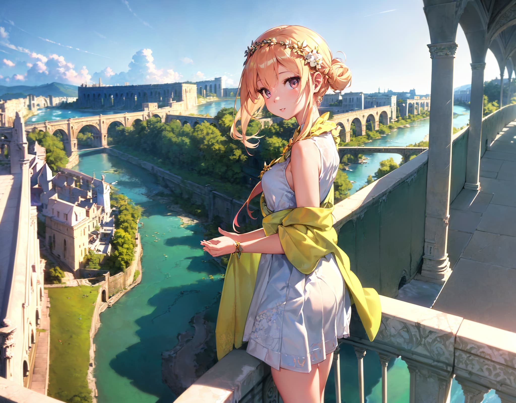 プロンプトは1,3枚目です、2枚目は(a girl standing on a balcony next to a river:1.5)などにして狙っていました。いい感じの水道橋追求していきたいです。