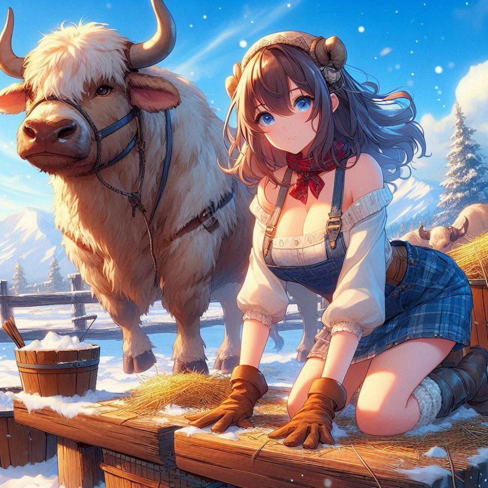美少女ファンタジー、牧場で働くモン娘牛娘のバストアップショット構図