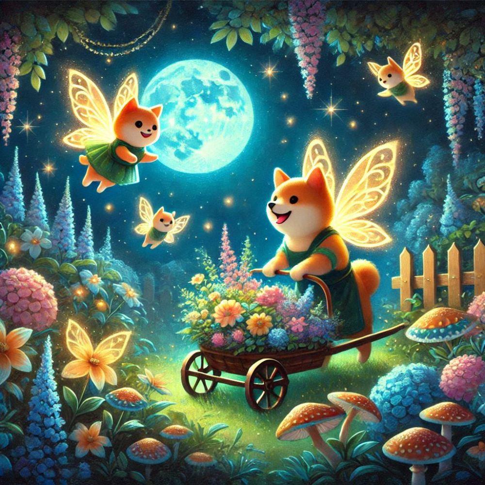 アクリルファンタジー、真夜中に花畑の作業を手伝う小さな妖精柴犬