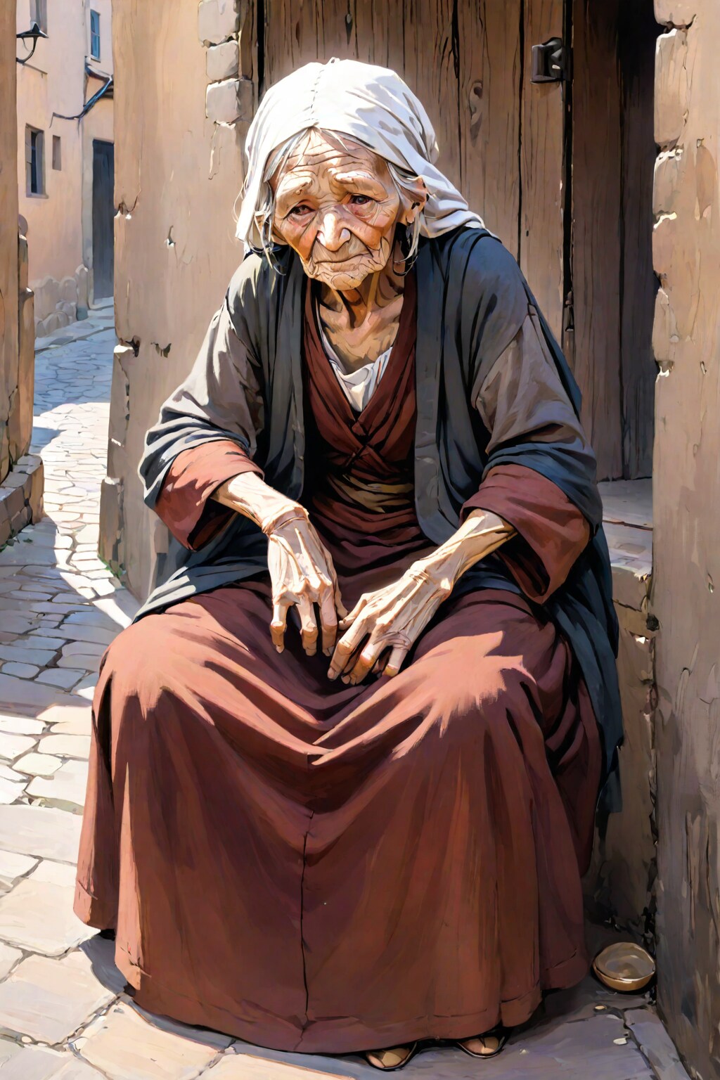 むかしむかし、ある町に一人の老いた乞食女がいました。彼女は毎日町の通りを歩き回り、施しを求めていました。しかし、ほとんどの人々は彼女を無視し、冷たく接しました。
