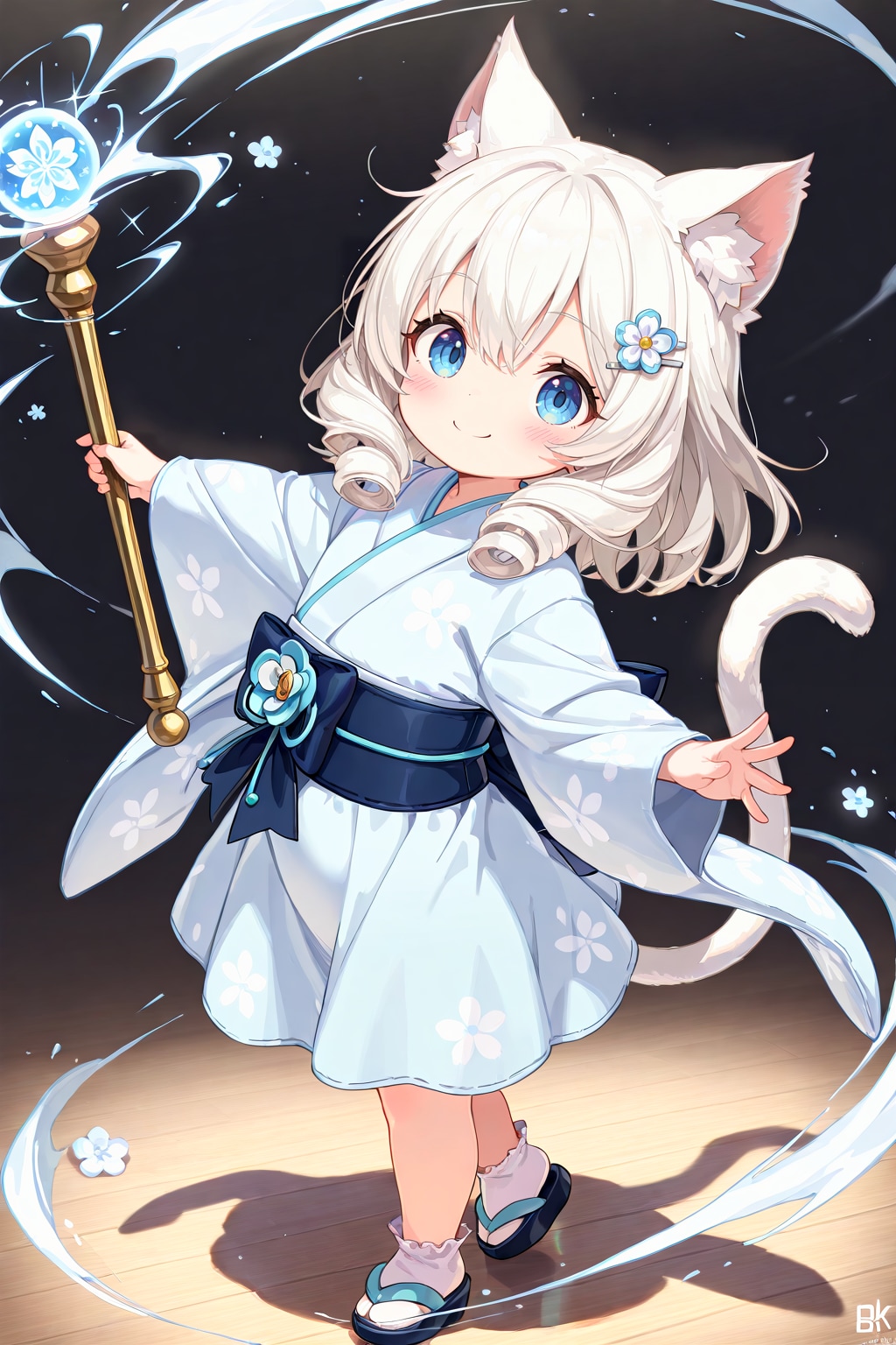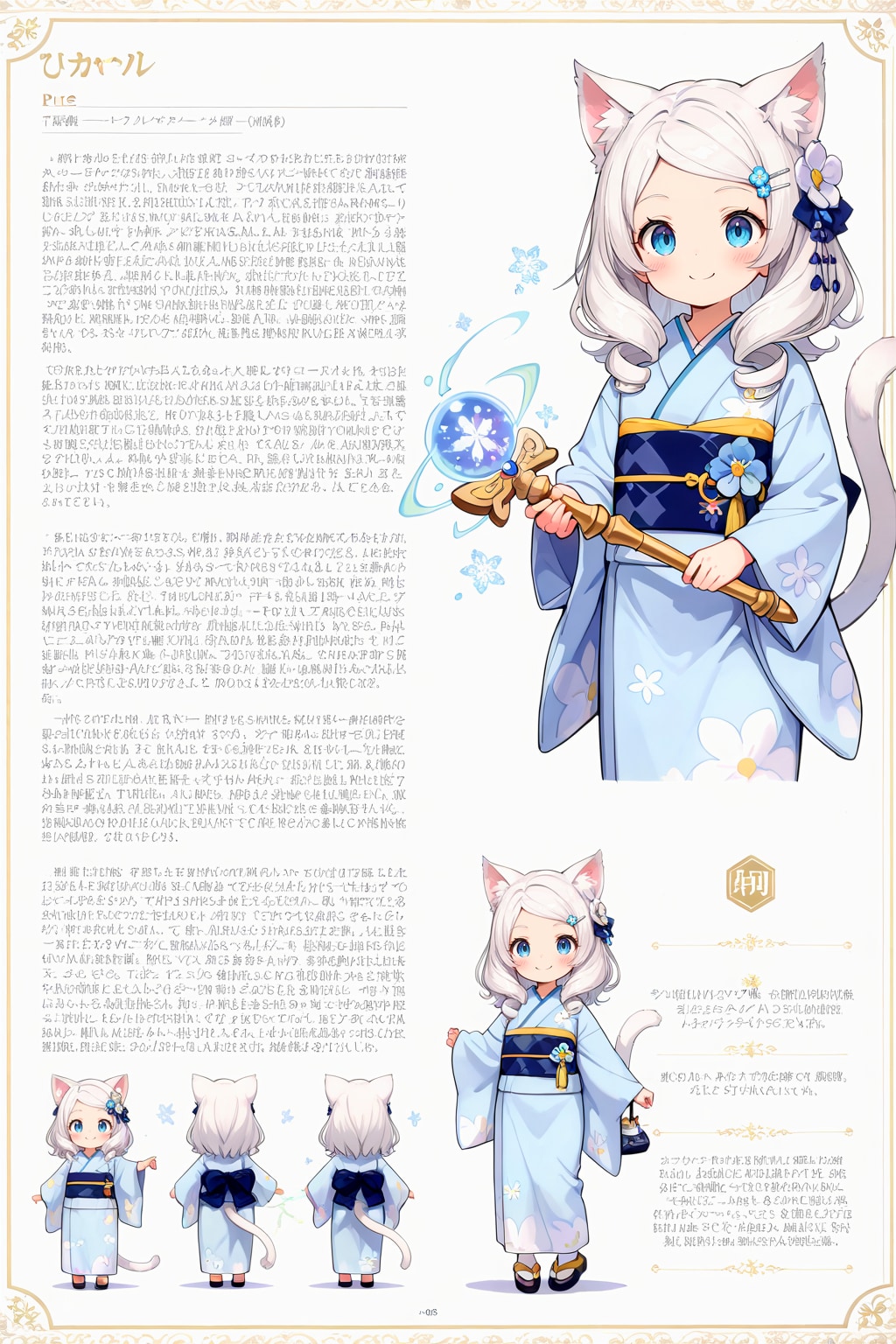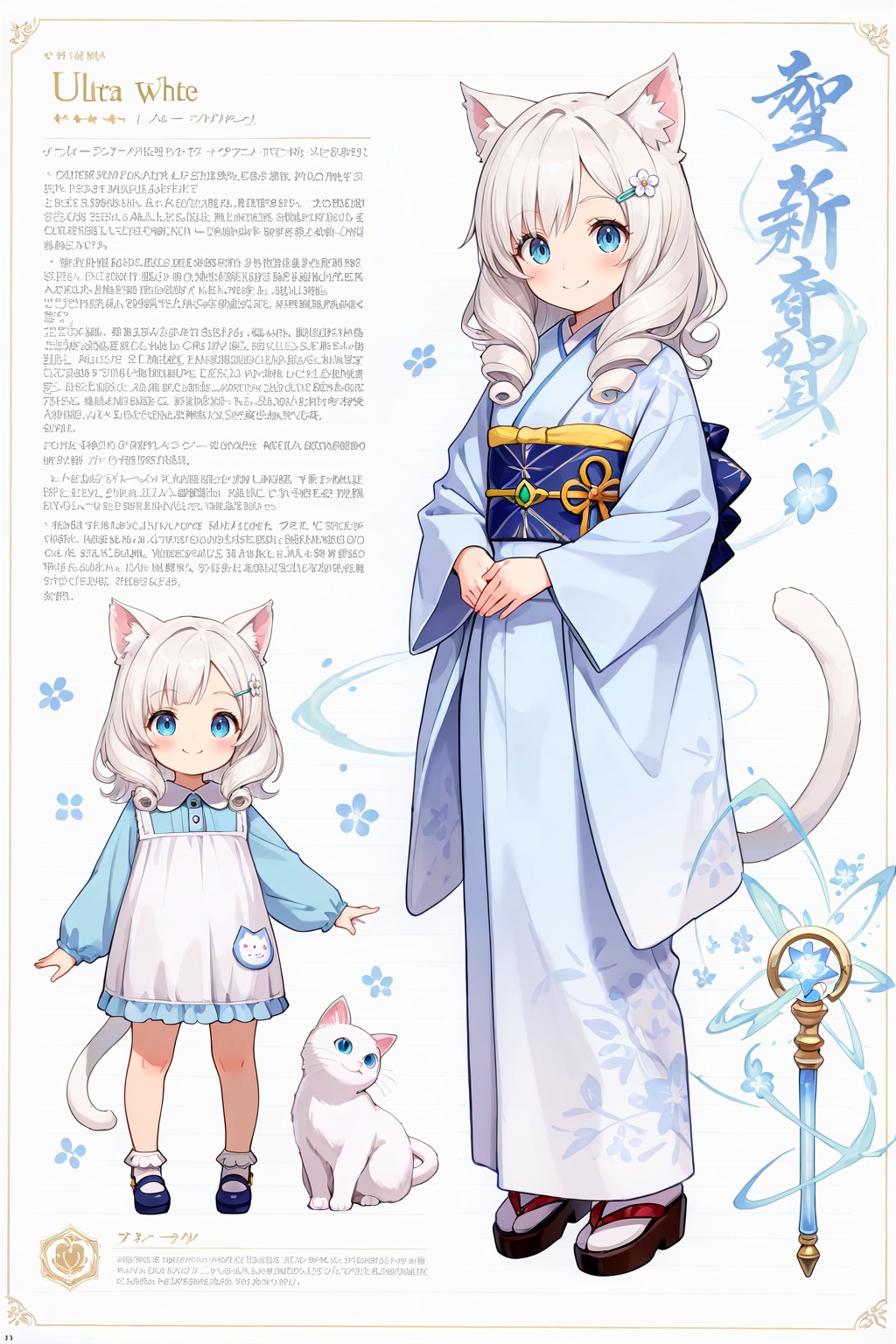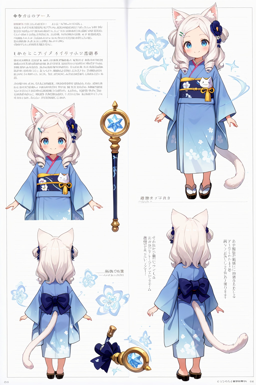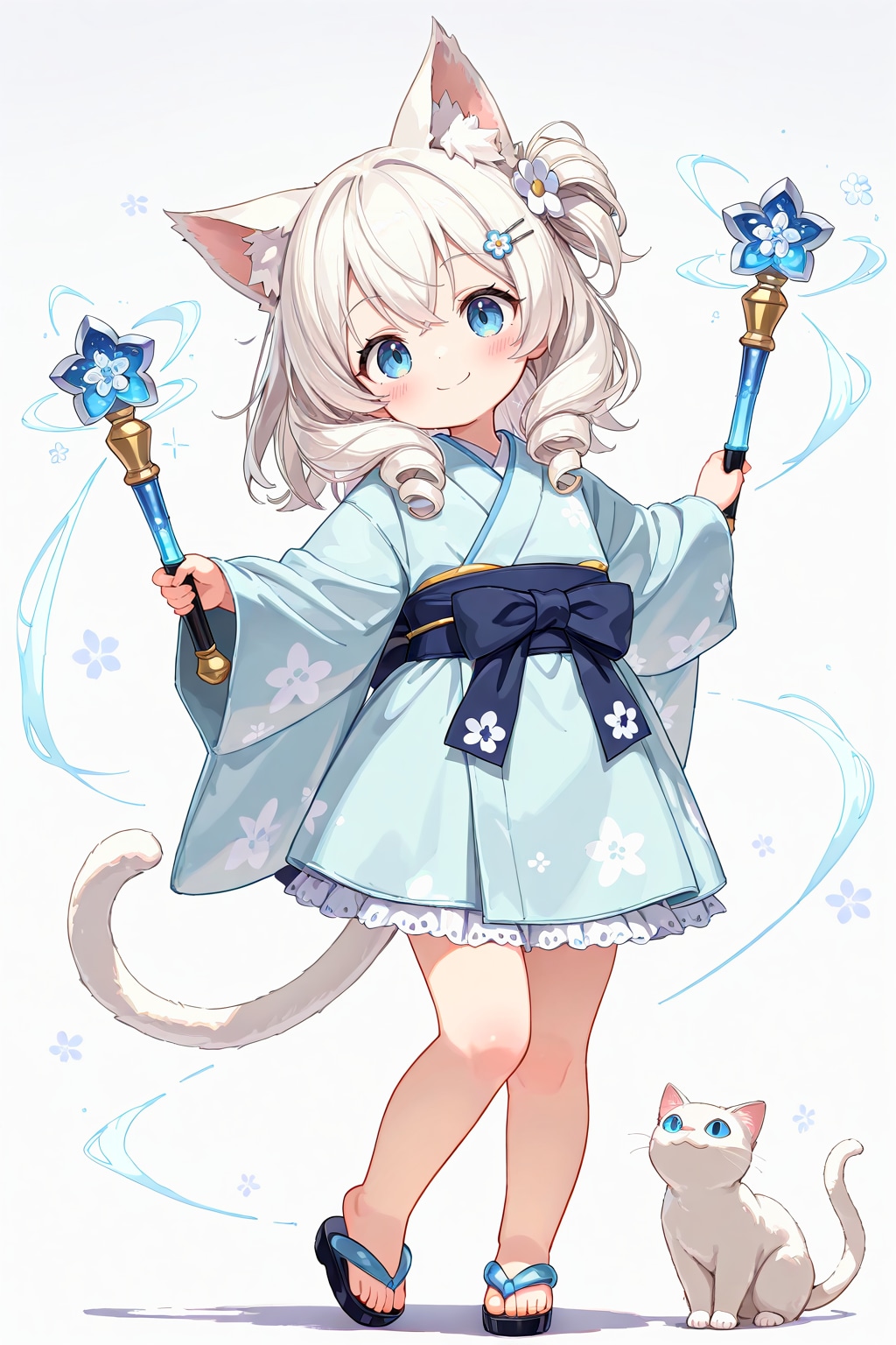 1 girl,toddler,white cat ears,white cat tail,pure white hair,medium hair,curl inward hair,blue eyes,white hairpin,kimono