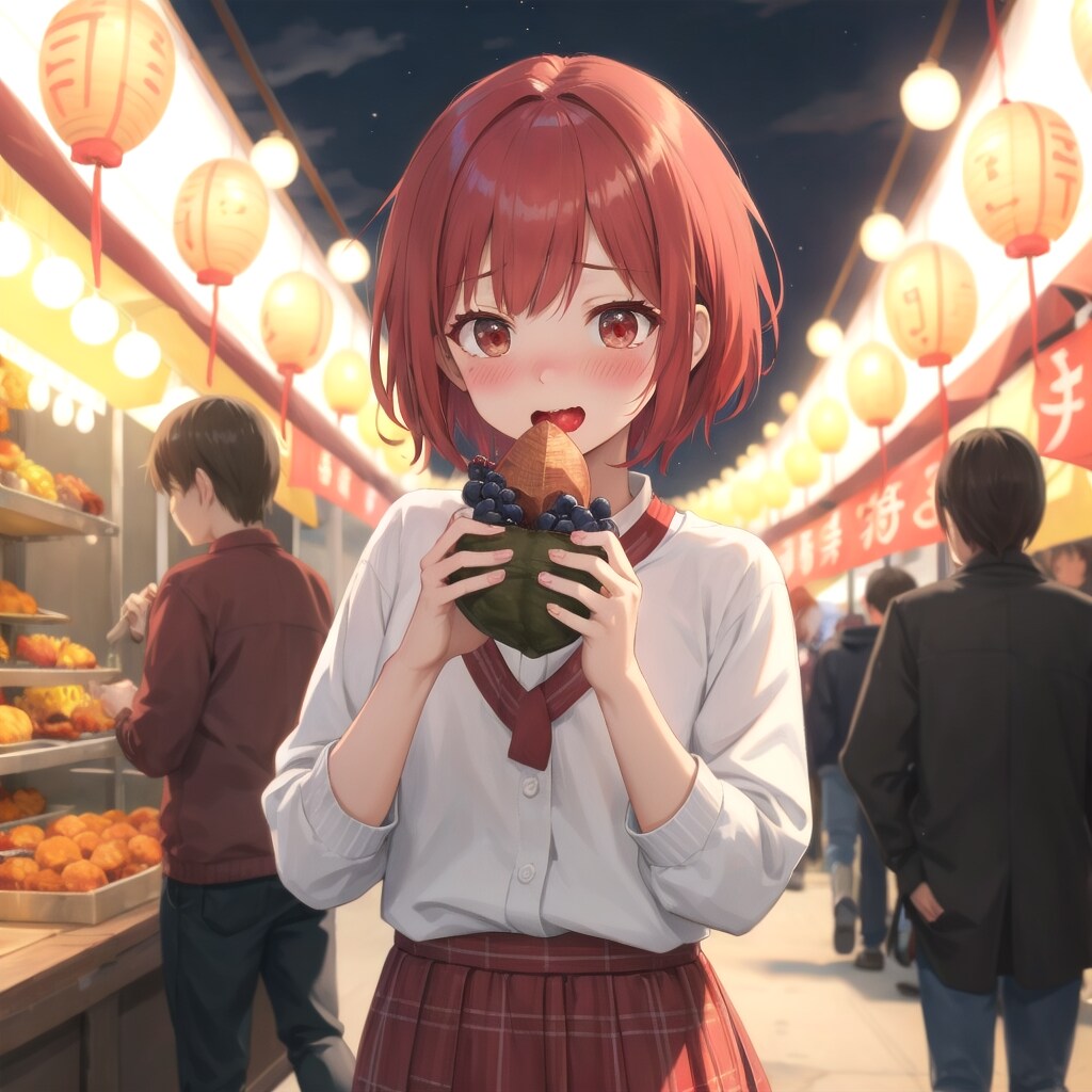 秋祭りの出店で買った焼き芋を、ねいが恥ずかしそうに差し出してくれる。屋台の灯りに照らされて、頬も耳も真っ赤になっている姿が愛らしい。