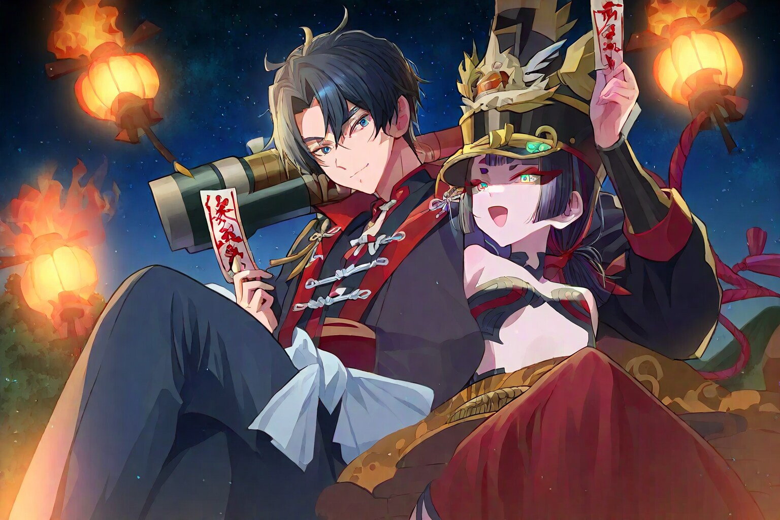隣には安倍晴明が立つ。緑の髪が炎の光に照らされ、中国の法服を思わせる赤と黒の衣装が鮮やかだ。右手には呪符を握り、彼の背後には陰陽の力が漂う。「鬼よ、その傲慢さが貴様の終焉を招くと知れ」晴明は冷静でありながらも、すべてを見透かすかのような表情を浮かべる。その瞳には確信が宿り、いつでもこの闇を切り裂けると信じている。