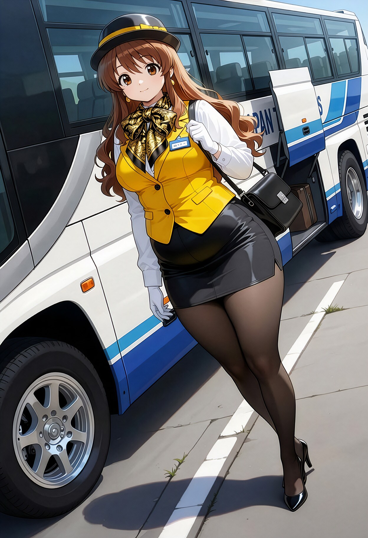 Geminiで背景のバスとガイドさんのスカーフを召喚しています。