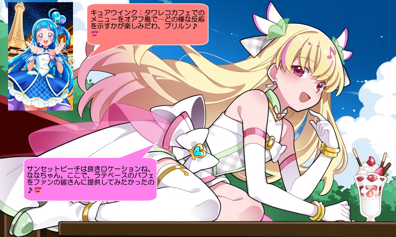 キュアズキューン:サンセットビーチは良きロケーションね、ななちゃん。ここで、ラテベースのパフェをファンの皆さんに提供してみたかったの♪😍
