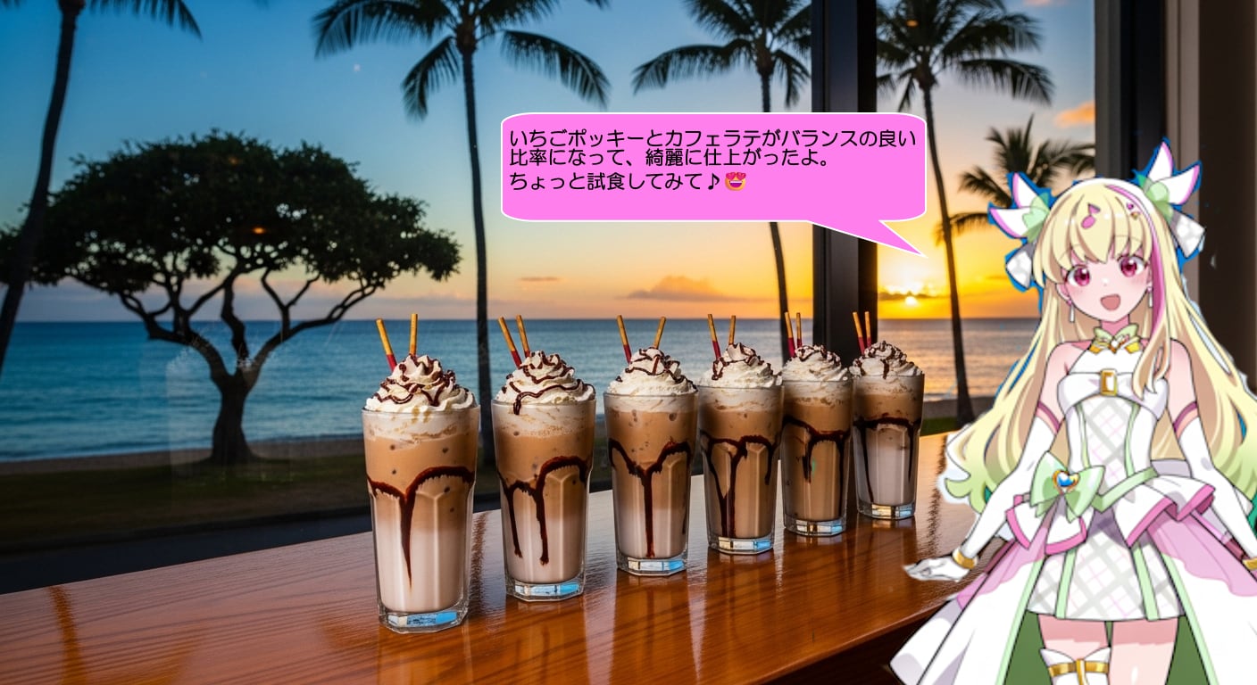そこで、キュアズキューン/プリルンがオアフ島内のサンセットビーチにあるレストランで、周囲にポッキー入りパフェ等を提供して喜ばせるシーンを描いてみました。😍