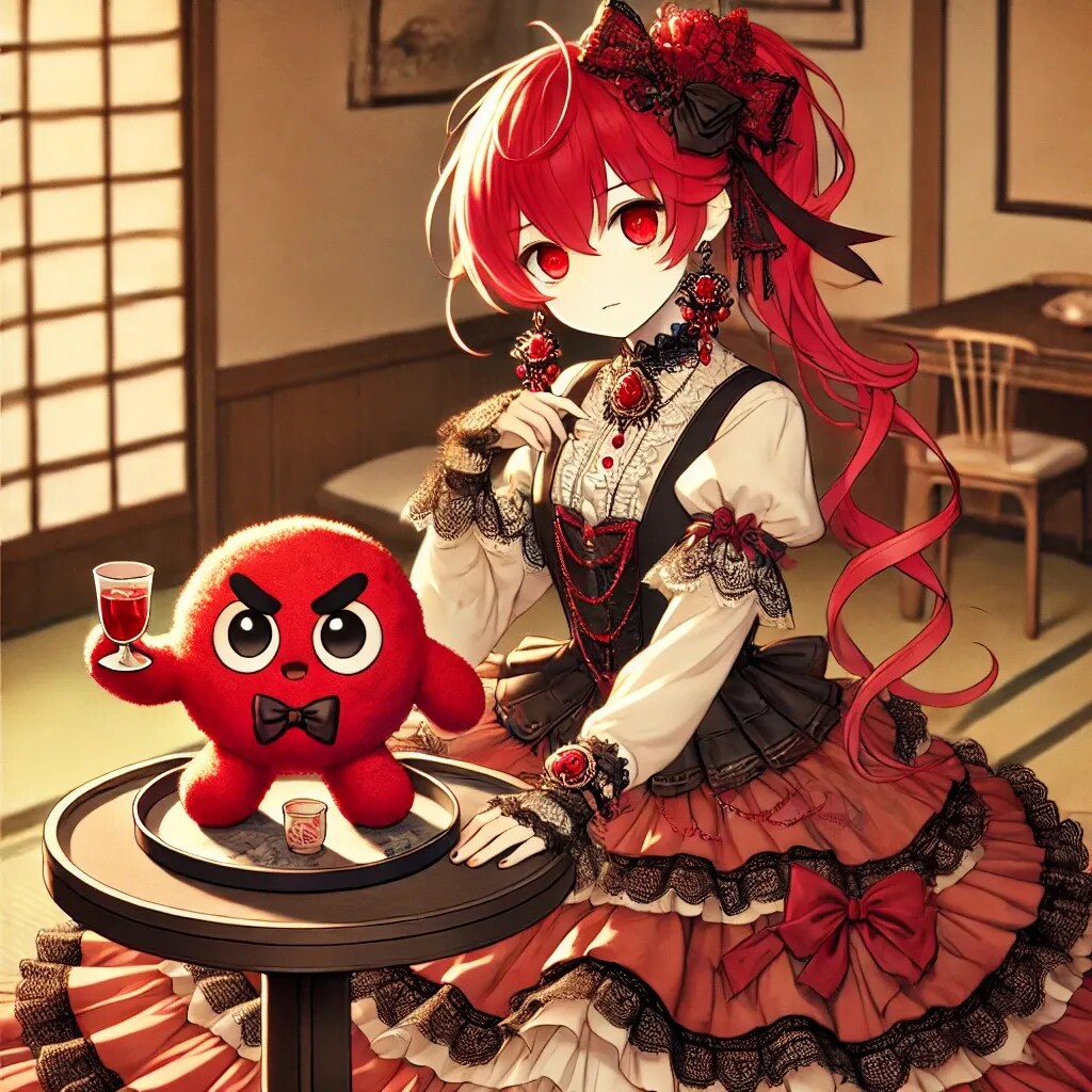 ・茶屋の落ち着いた和の雰囲気と、テーブルの上でポーズを決めるマッスルレッドの異色バランスが絶妙です。