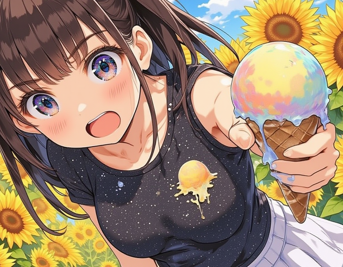 Composition: Close-up focus on the girl's shocked face and the ice cream-stained top, with sunflowers filling the background.
