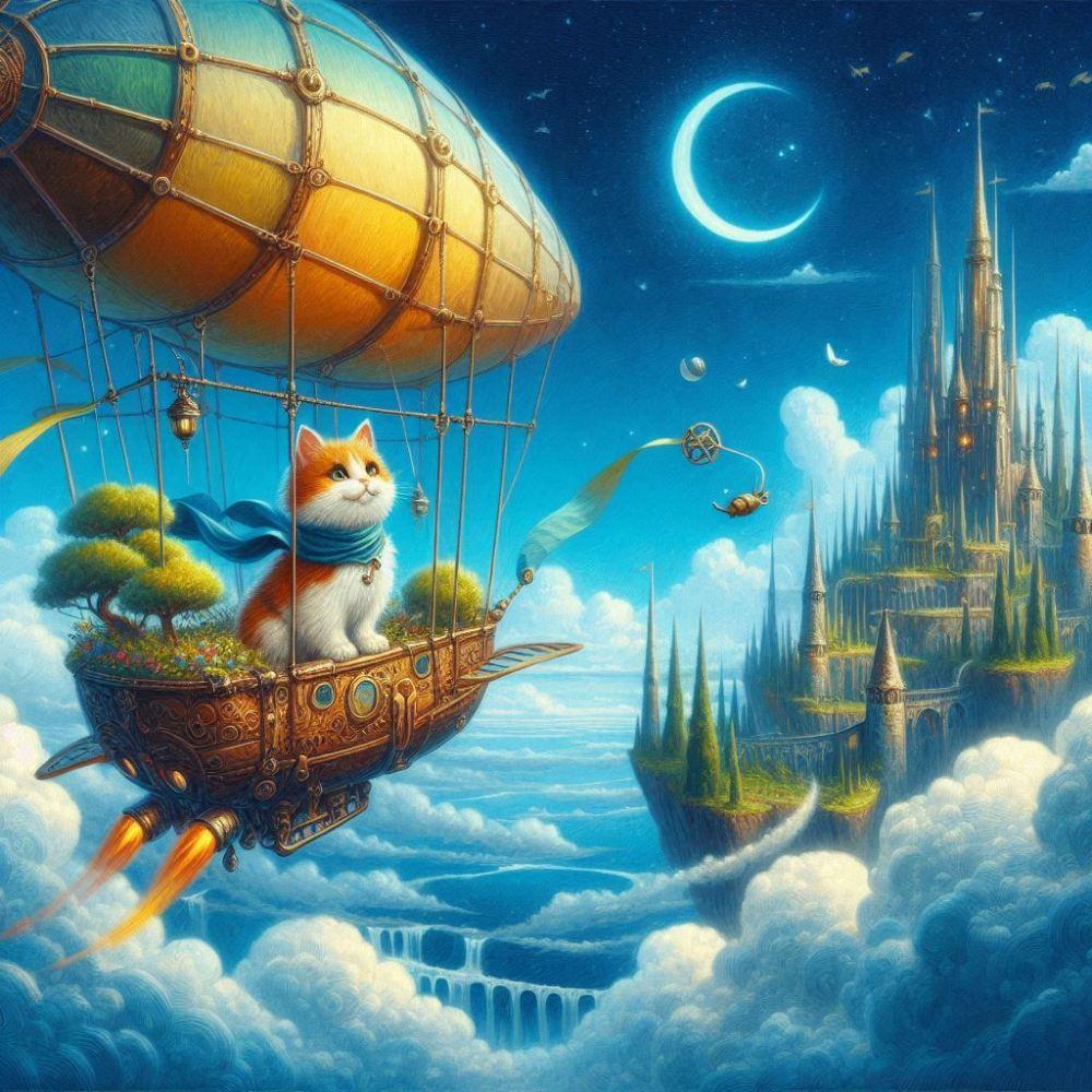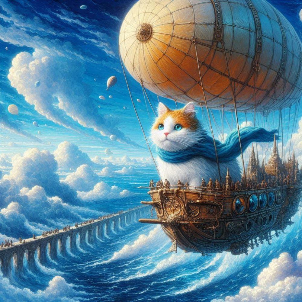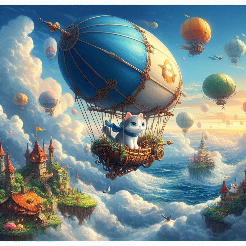 アクリルファンタジー、飛空艇で空の空中庭園に行く冒険者猫