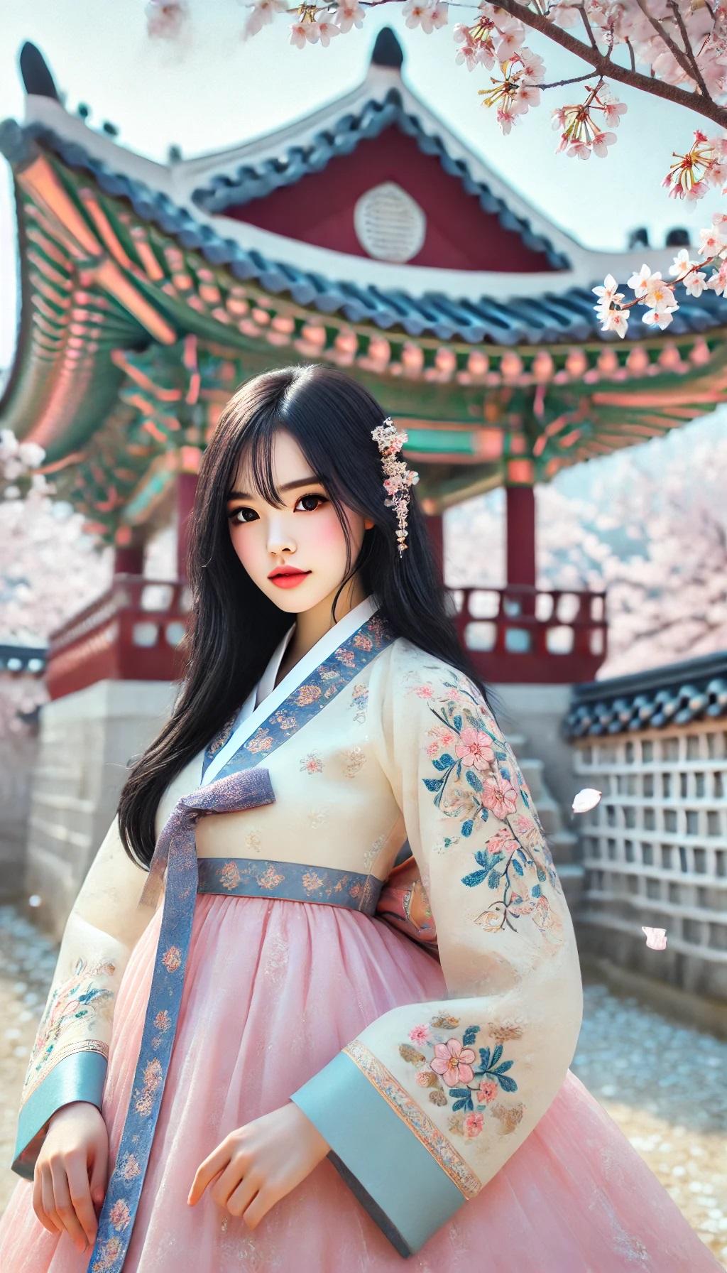 - 背景: 韓国の伝統的な建築物の前や、桜が咲き誇る春の景色の中で。