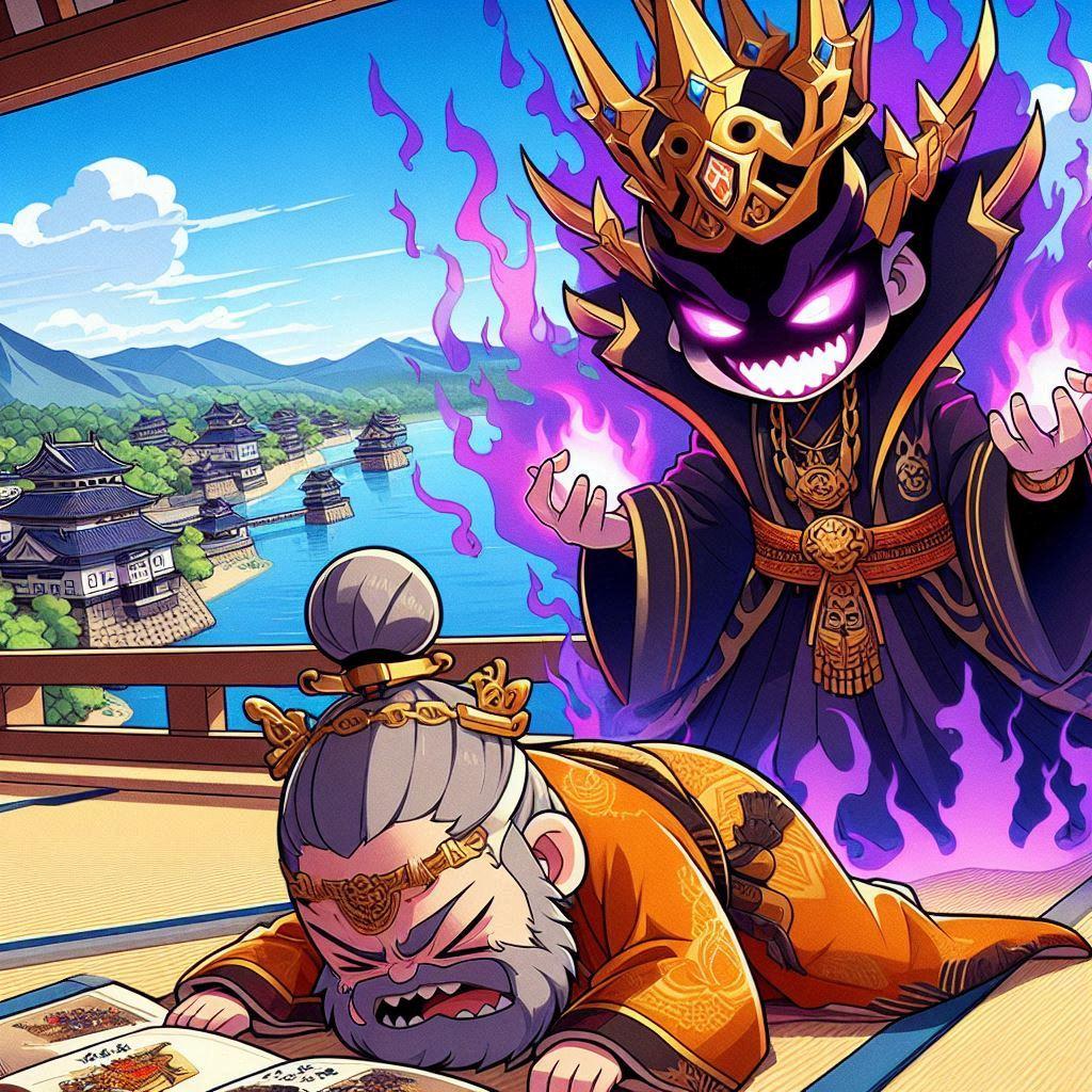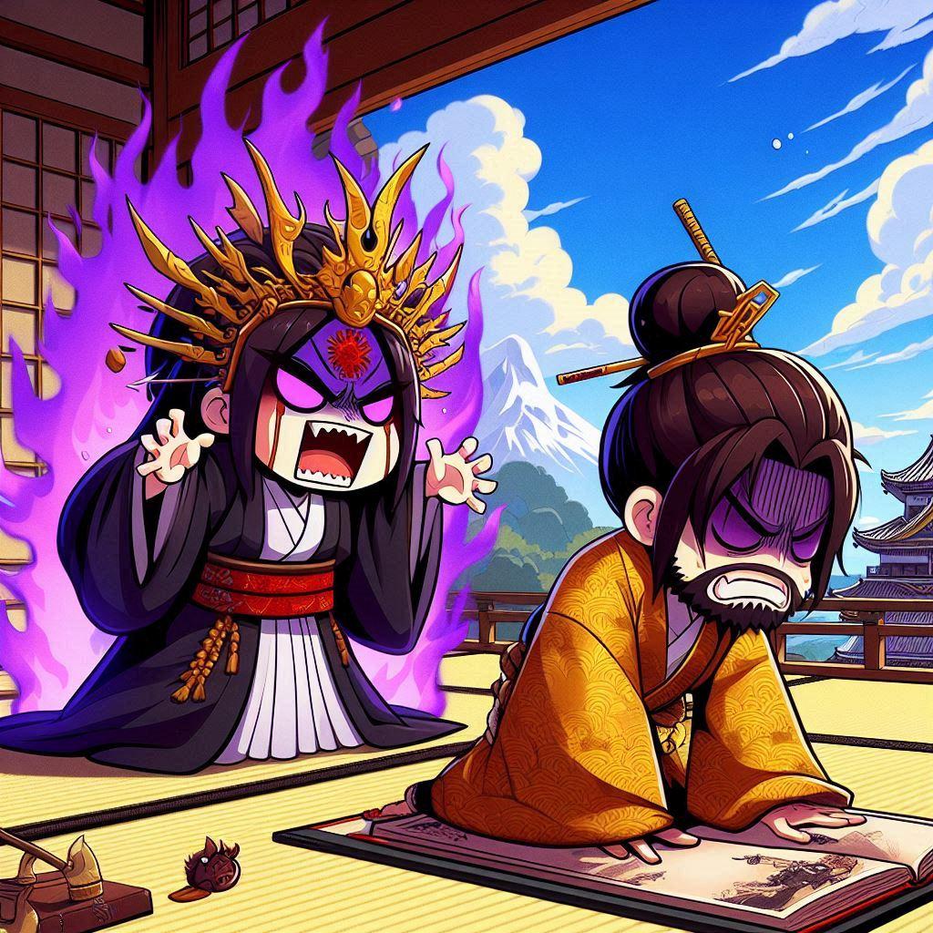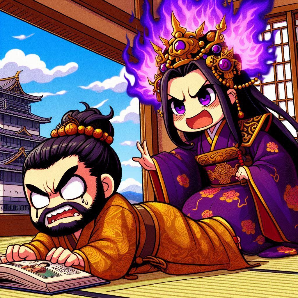 ヒノモトのお城の天守閣。ヨミコが声を荒げて、大陸の歴史書を畳に叩きつけた。側の小男は豪奢な身なりだが、恐怖に震えている。