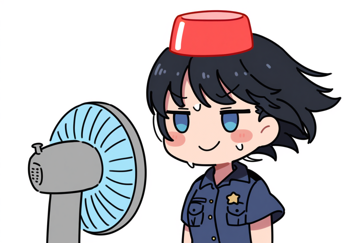 girl, blue eyes, black hair, short hair, red police siren light on head, chibi, police, smug face, smirk, electric fan, sweat, flowing hair