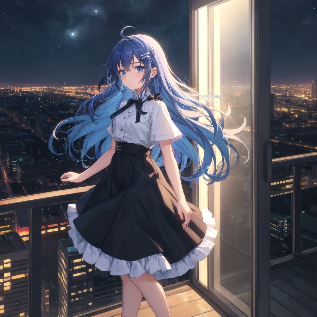 都会の屋上から夜空を見上げるチサちゃん。静かな瞳に映るのは、星とネオンが交じり合う光景。寡黙な彼女の心に、言葉にならない想いが揺らいでいる。