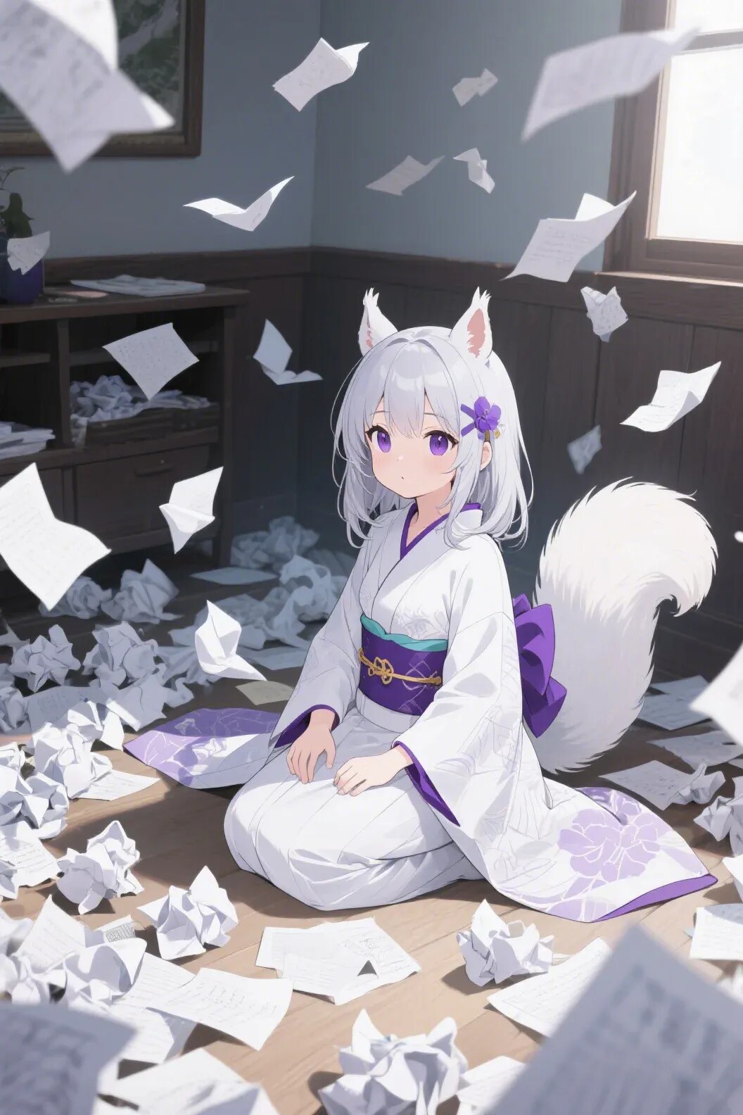 現実の部屋、護符を書き損じて丸めた紙が大量に散らばる部屋