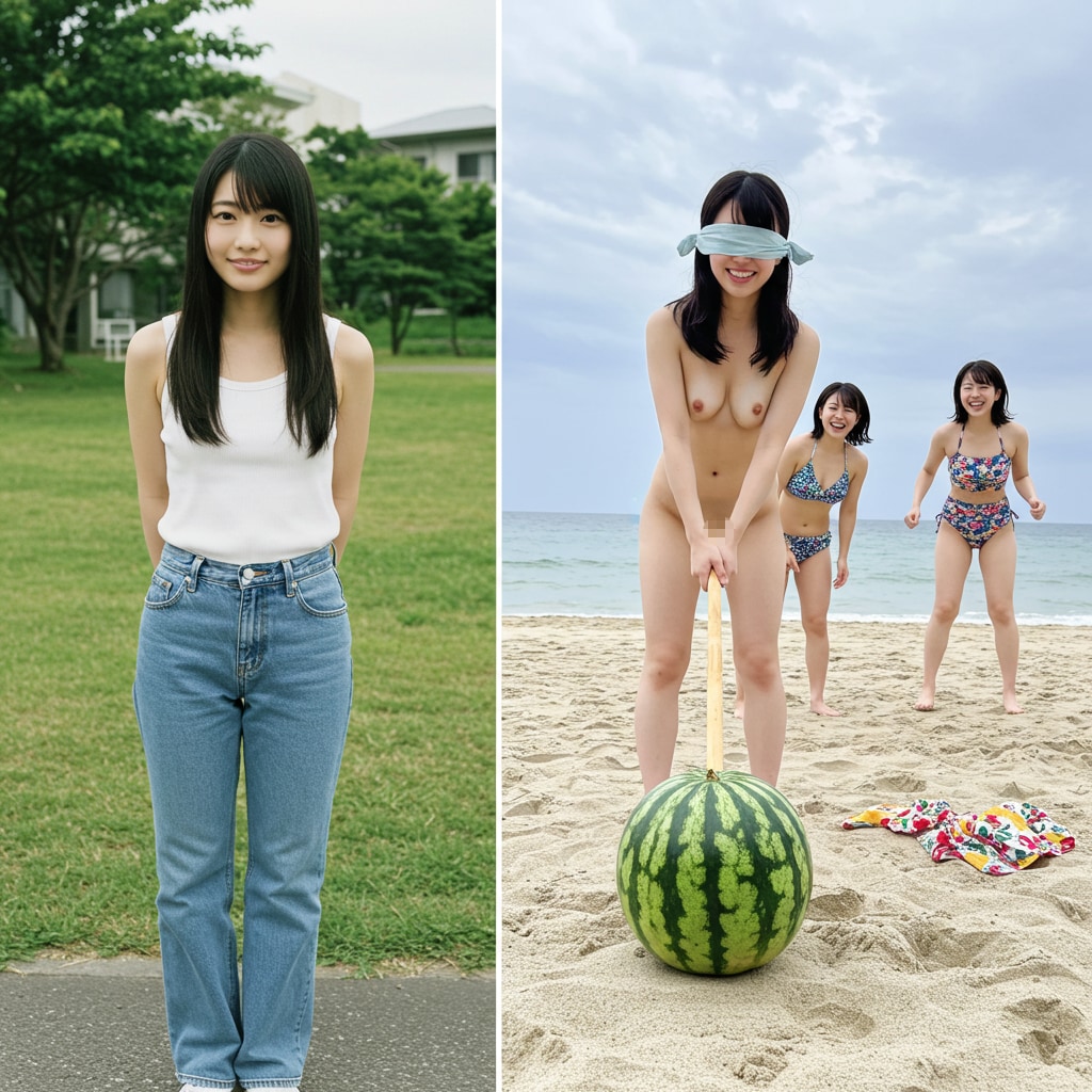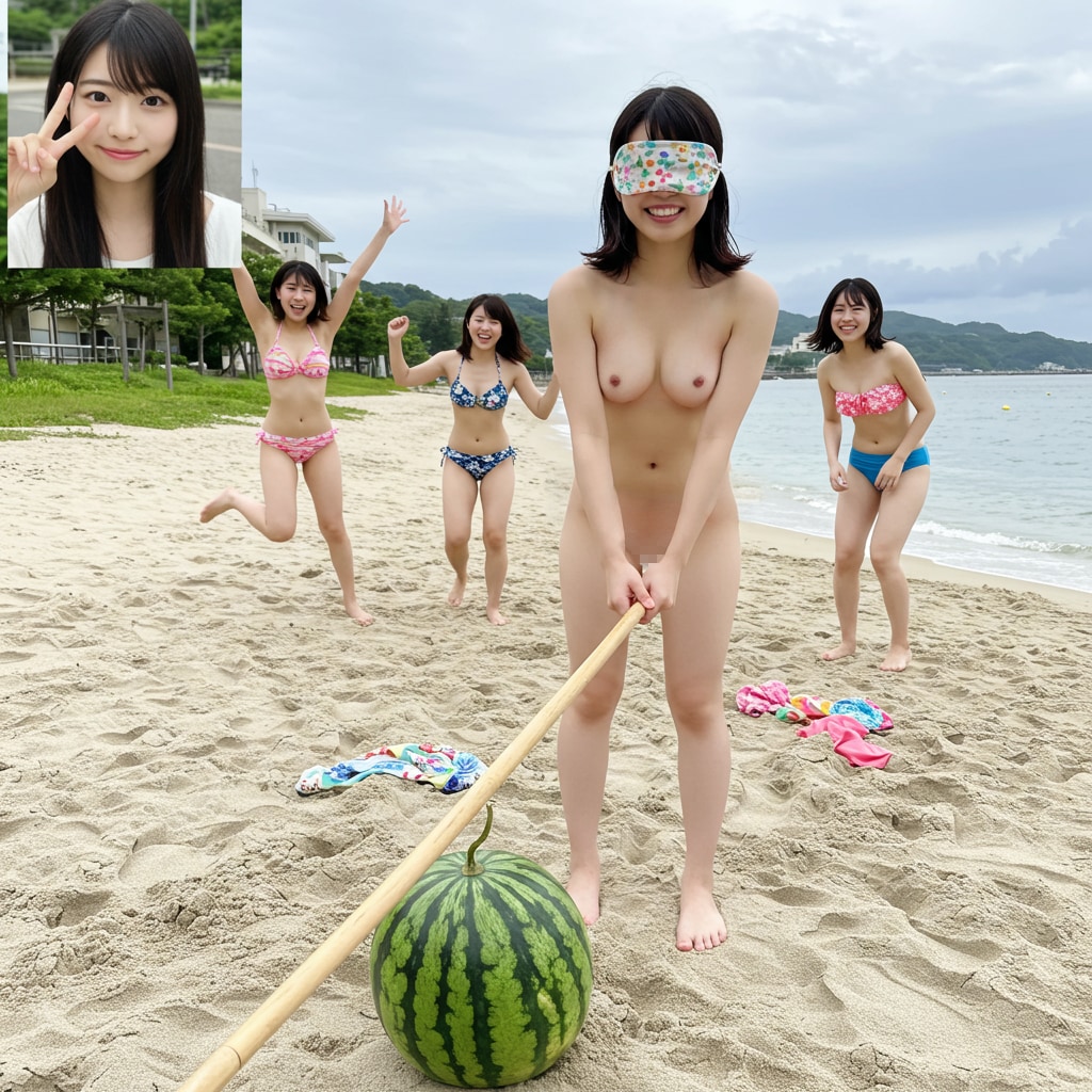 スイカ割りで失敗したら1枚脱ぐという罰ゲーム付きで始めた結果、全裸でスイカ割りをするはめになるという画像。