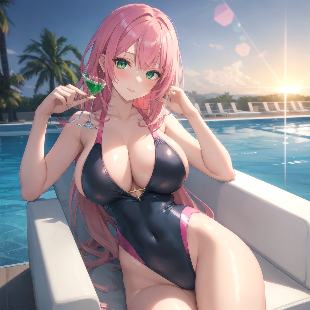 高級ホテルのプールサイド、夕陽に染まる水面を背に、優雅にグラスを傾ける。モデルとしての洗練と、初めての大胆な表情が交差する瞬間。