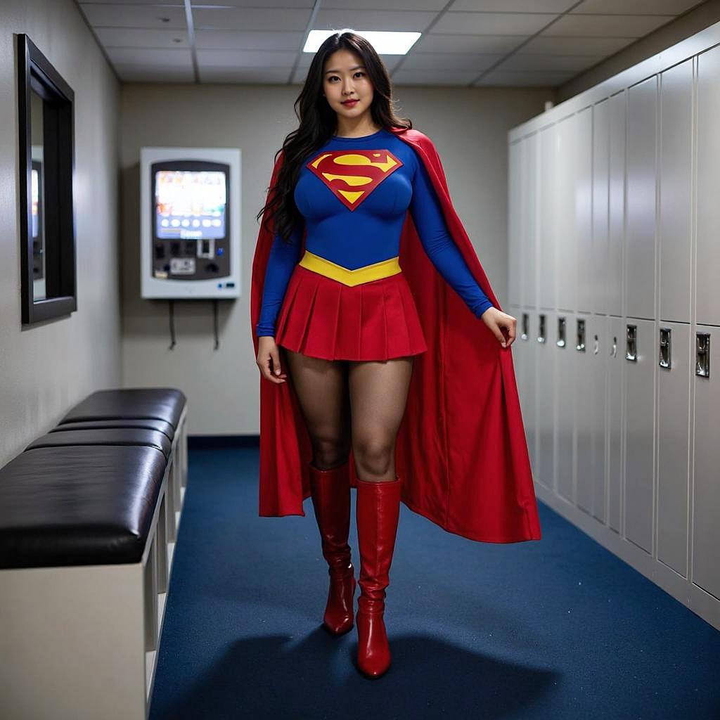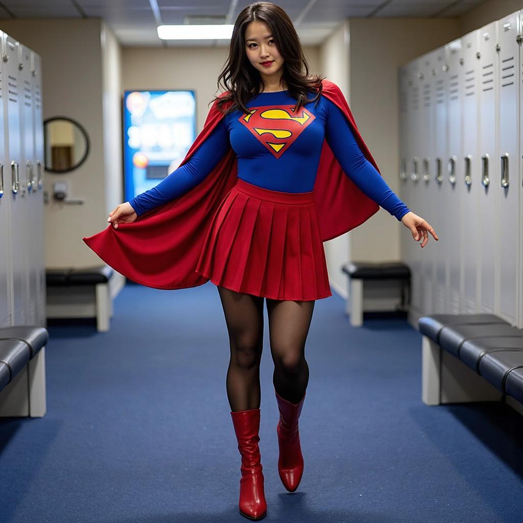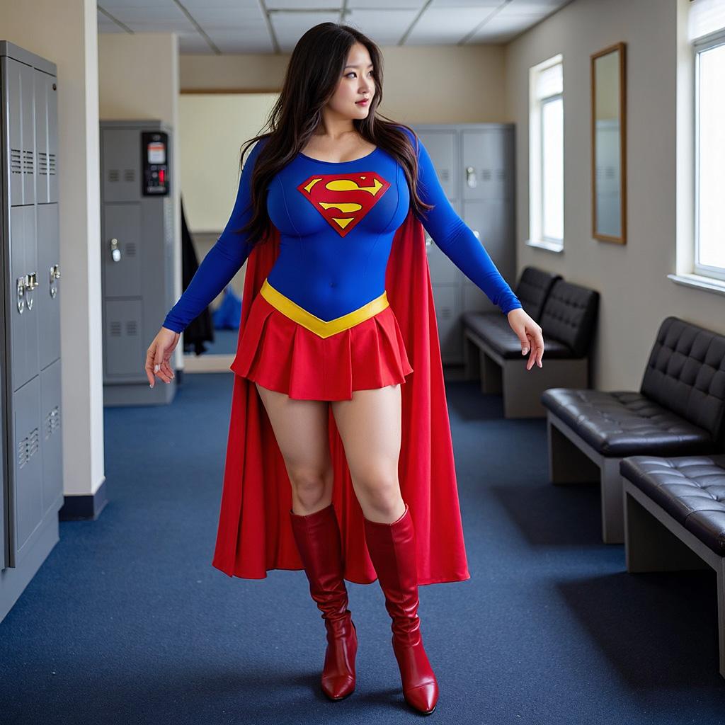 ロッカールームでスーパーガールのコスプレ衣装を試着する女性