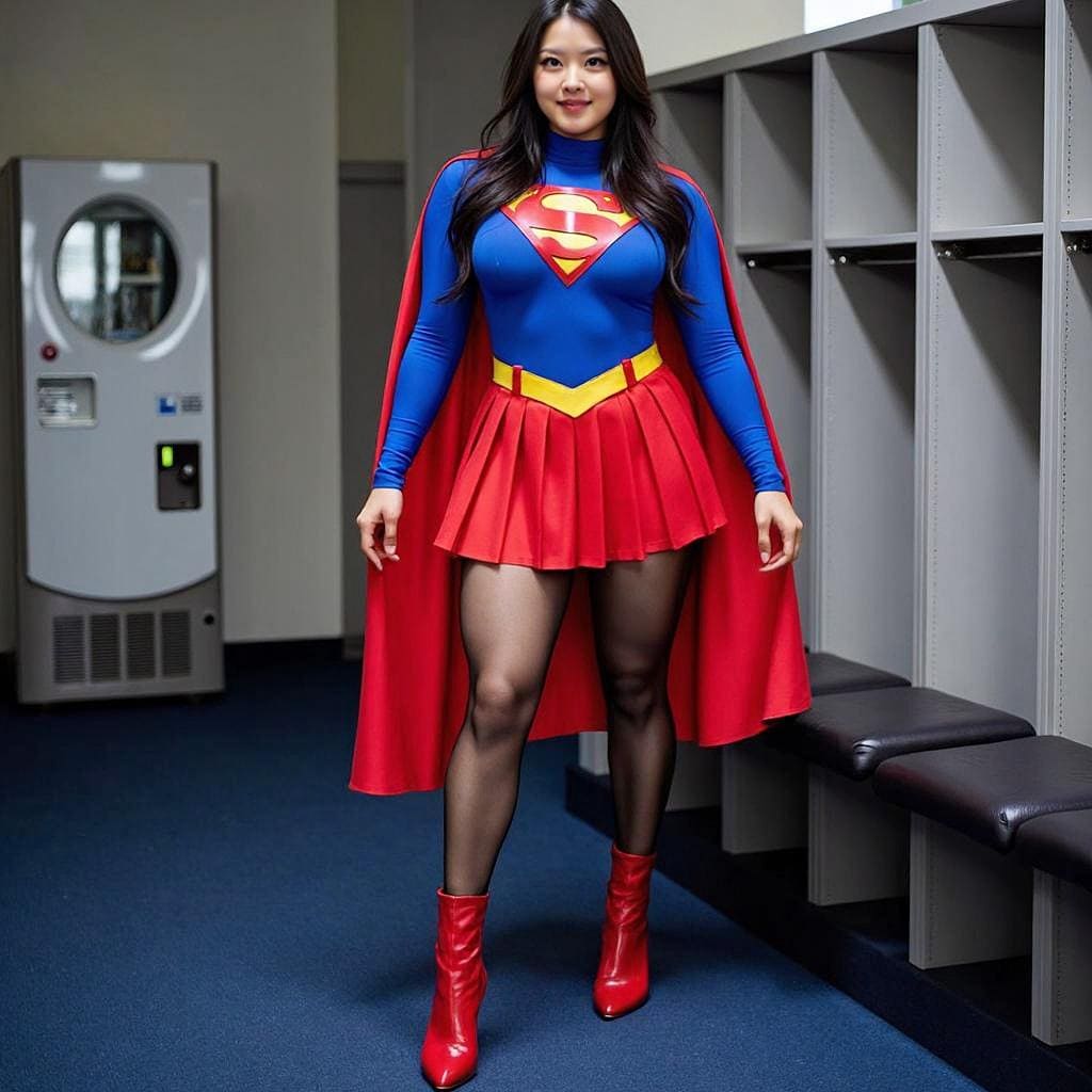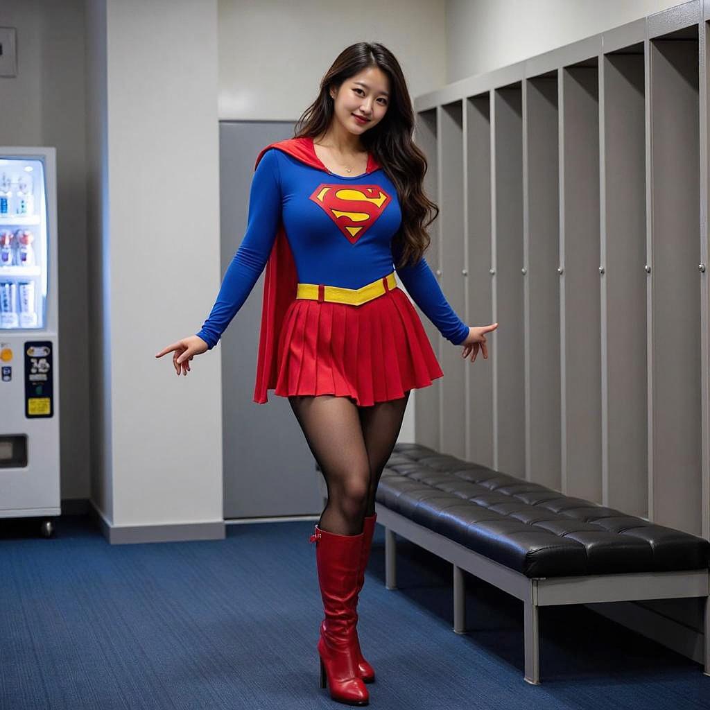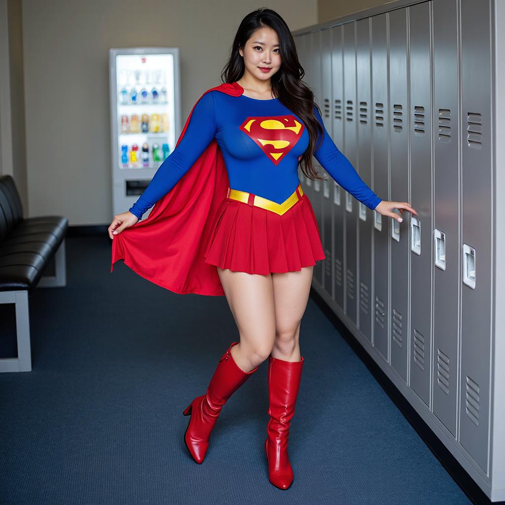 ロッカールームでスーパーガールのコスプレ衣装を試着する女性
