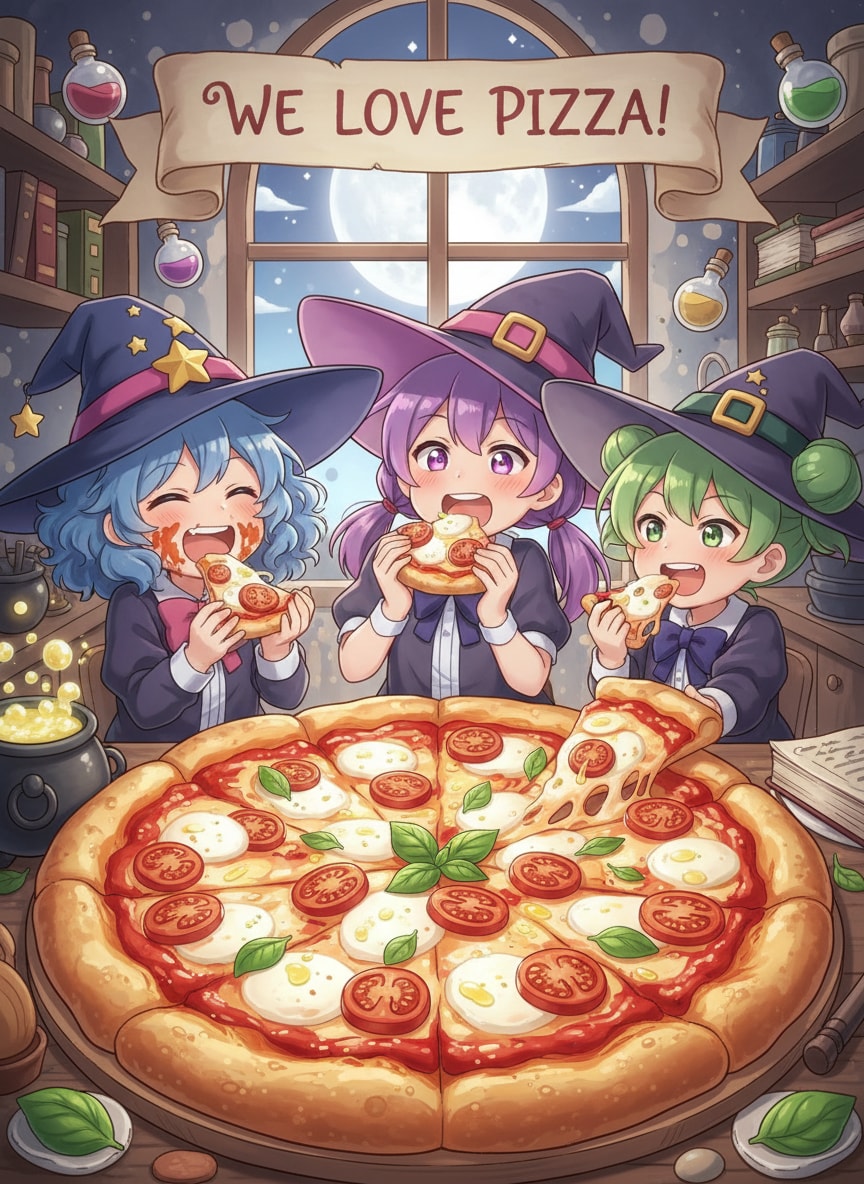 "The three little witch sisters are crazy about pizza."