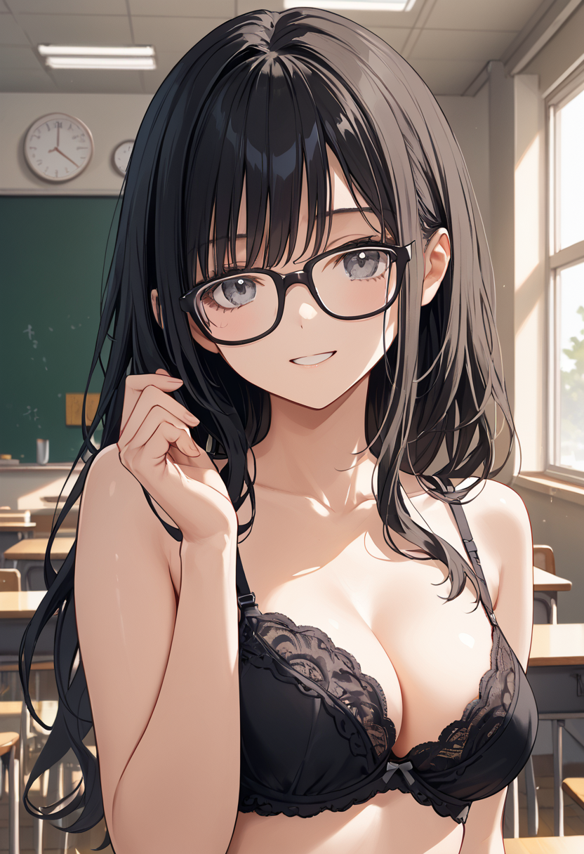 1girl,bangs,medium breasts,black long hair,leg_garter,black glasses,gray eyes