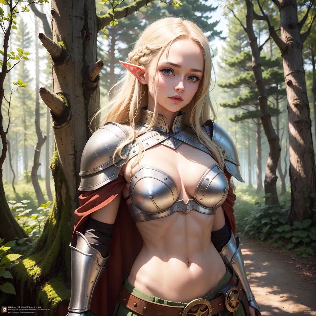 壮大な森の中に立つエルフの戦士が、堂々とした装いでこちらを見つめています。鋭い眼差しと耳の形が彼女の異世界的な起源を物語り、手にした剣がその戦闘の準備を示唆しています。鎧とマントは彼女の防御力と品位を高め、周囲の自然との調和を感じさせます。このイメージは、ファンタジーの世界への入り口のようで、冒険と物語が待っていることを約束しているかのようです。