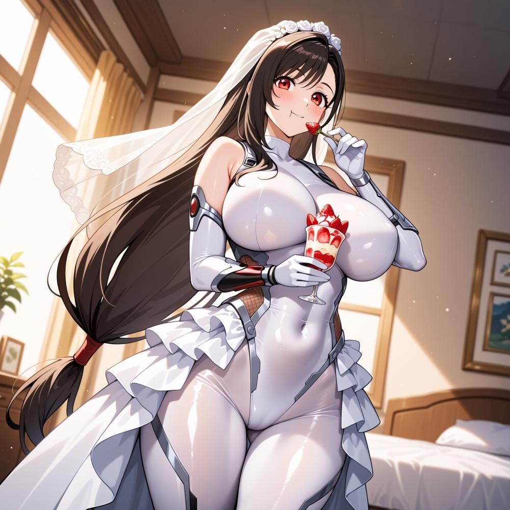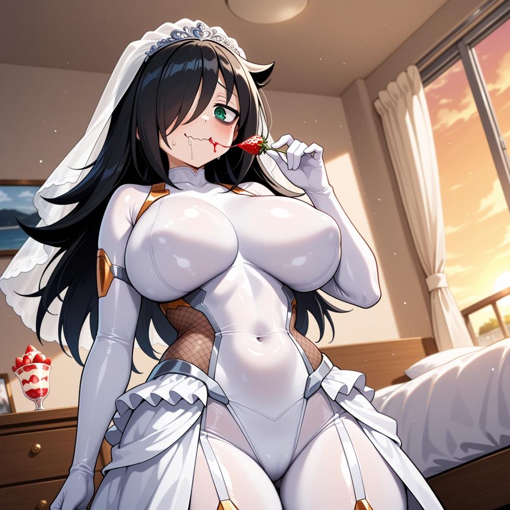 自室汚部屋でストロベリーパフェ食べる花嫁ボディスーツコスプレ人妻達