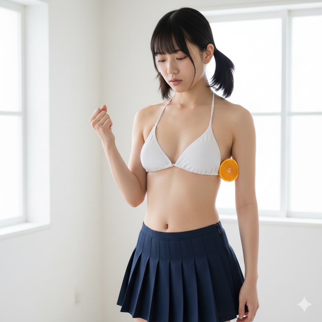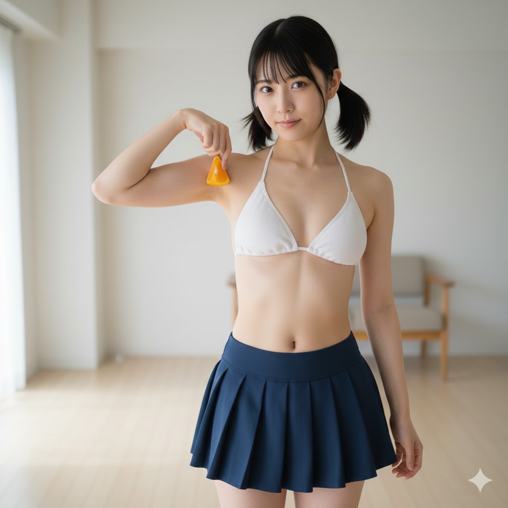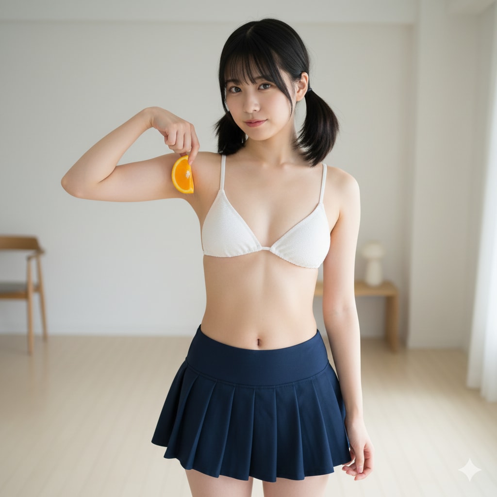 フェロモンたっぷりだよね~。絶対その男性落とせてると思うよ。で、今オレンジしかないけどワキに挟むから食べてよぉ~。ワキ汗たっぷり、女の子エキスたっぷりでとっても美味しくなるよっ。