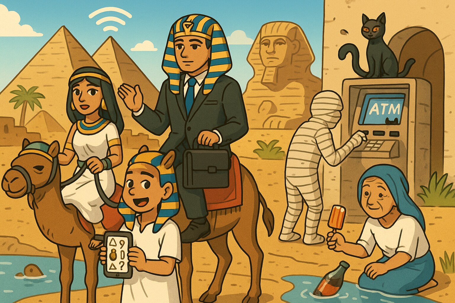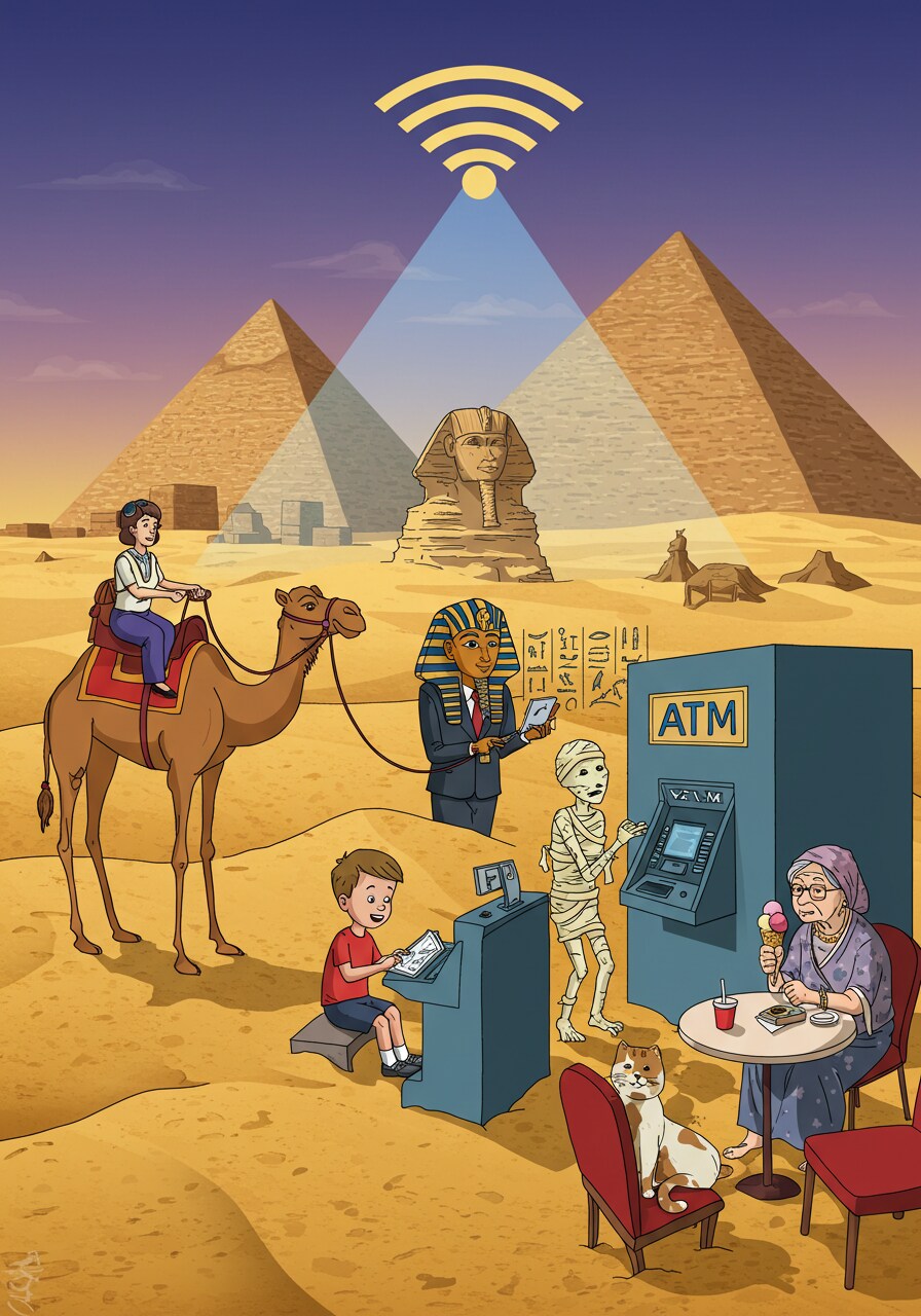 背景:ピラミッドとスフィンクス、Wi-Fiビームが出てる、砂に埋もれたナイル川