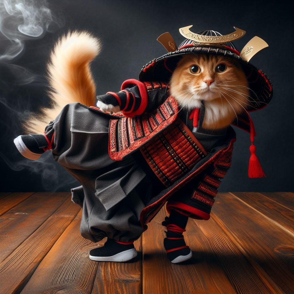 鎧と兜を着続ける猫