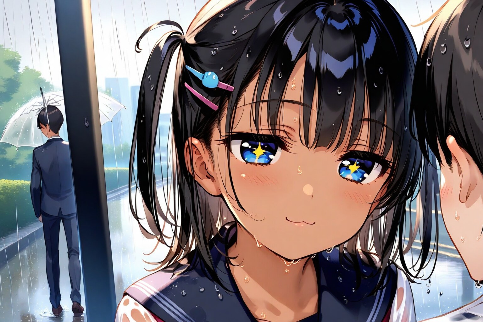 (⩌⩊⩌)「も〜服びしょびしょでイヤになっちゃうよ。ほら、肌黒いからしっかり見えちゃってるし。あれ?君の傘なんだから、悪いしもっとしっかり入っててよ」
