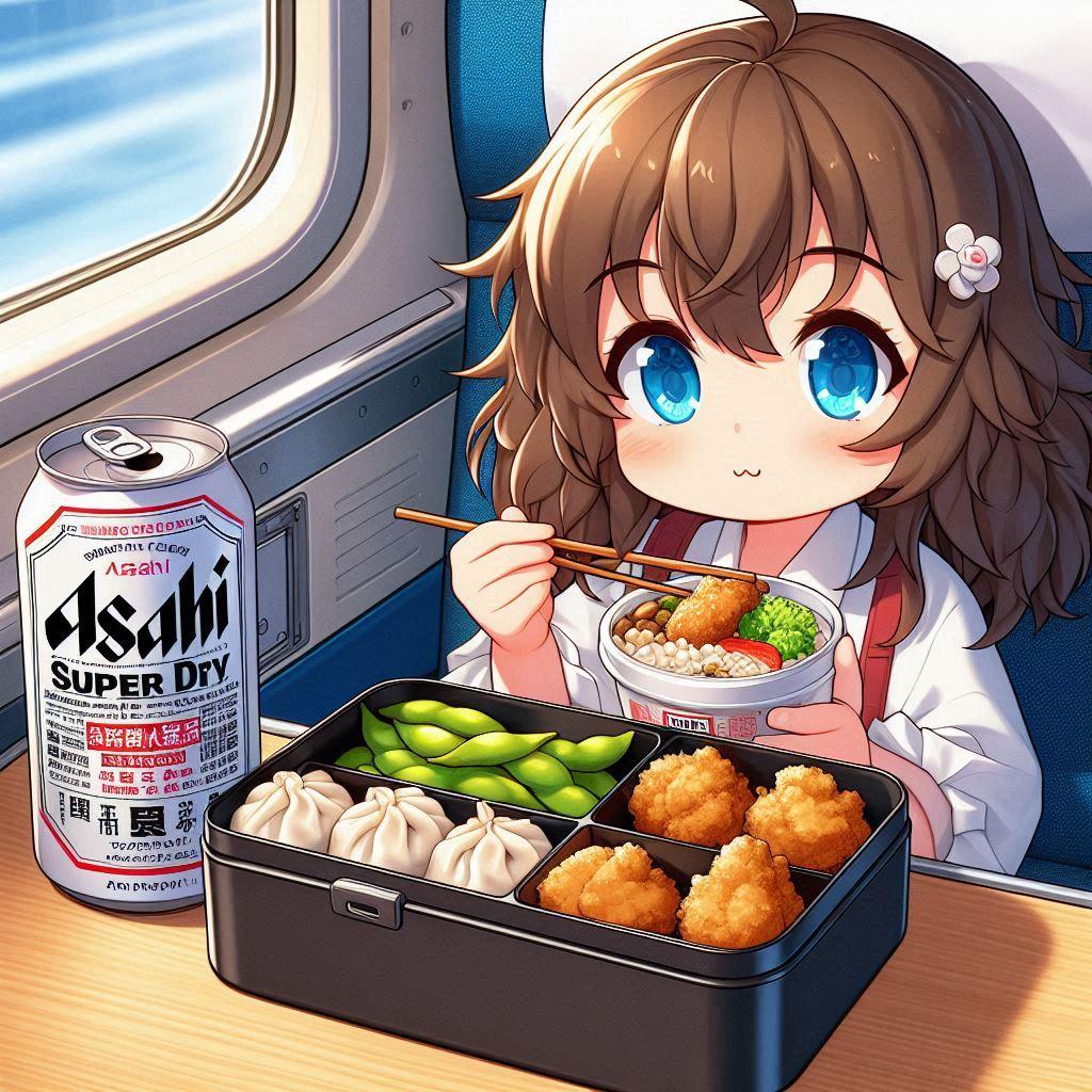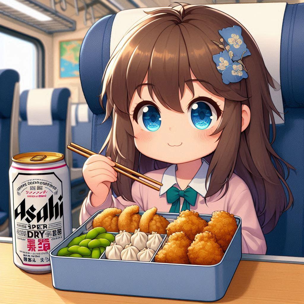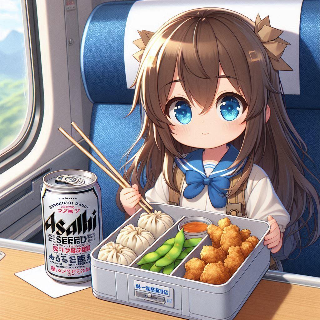 新幹線でお弁当を食べる小さな女の子