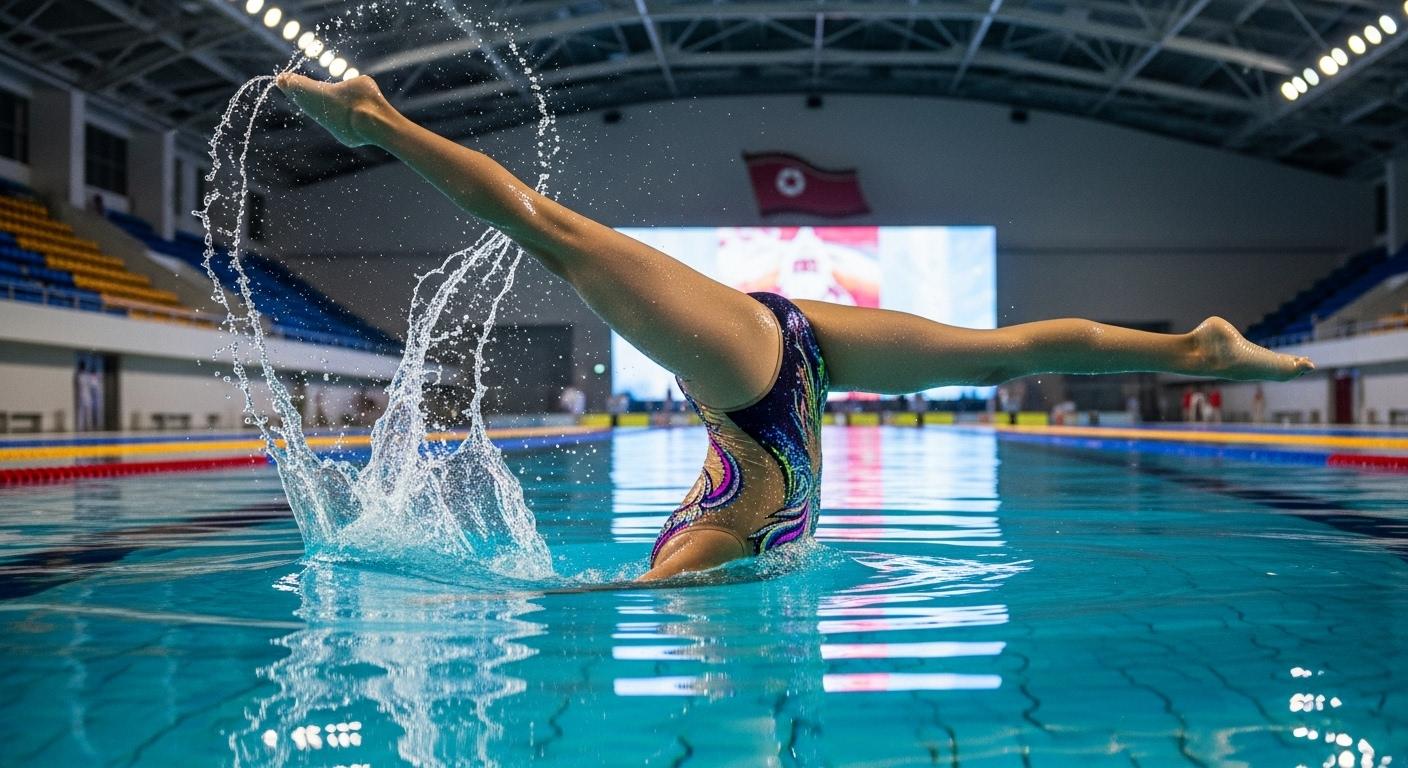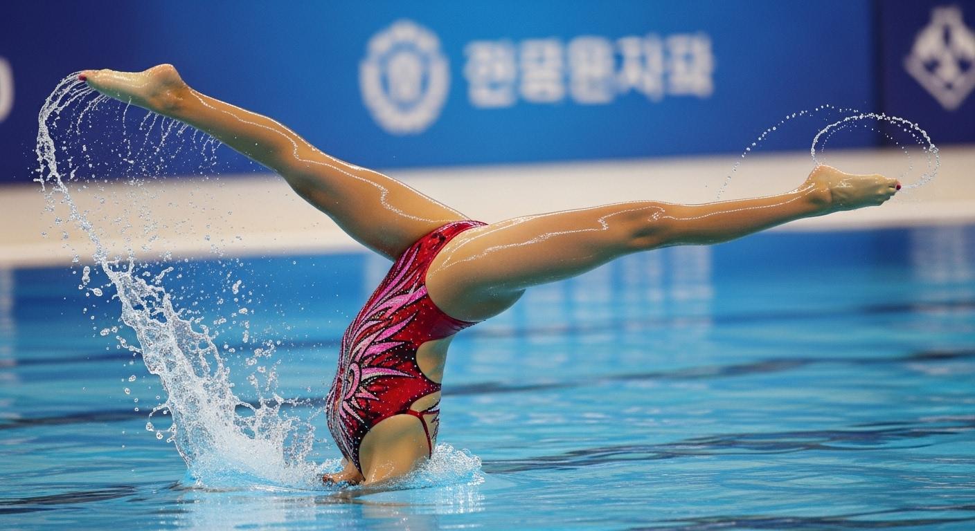 水中から高く上がって、美しい大開脚のアクションシーン。逆さま倒立の生成は難易度が高いです。